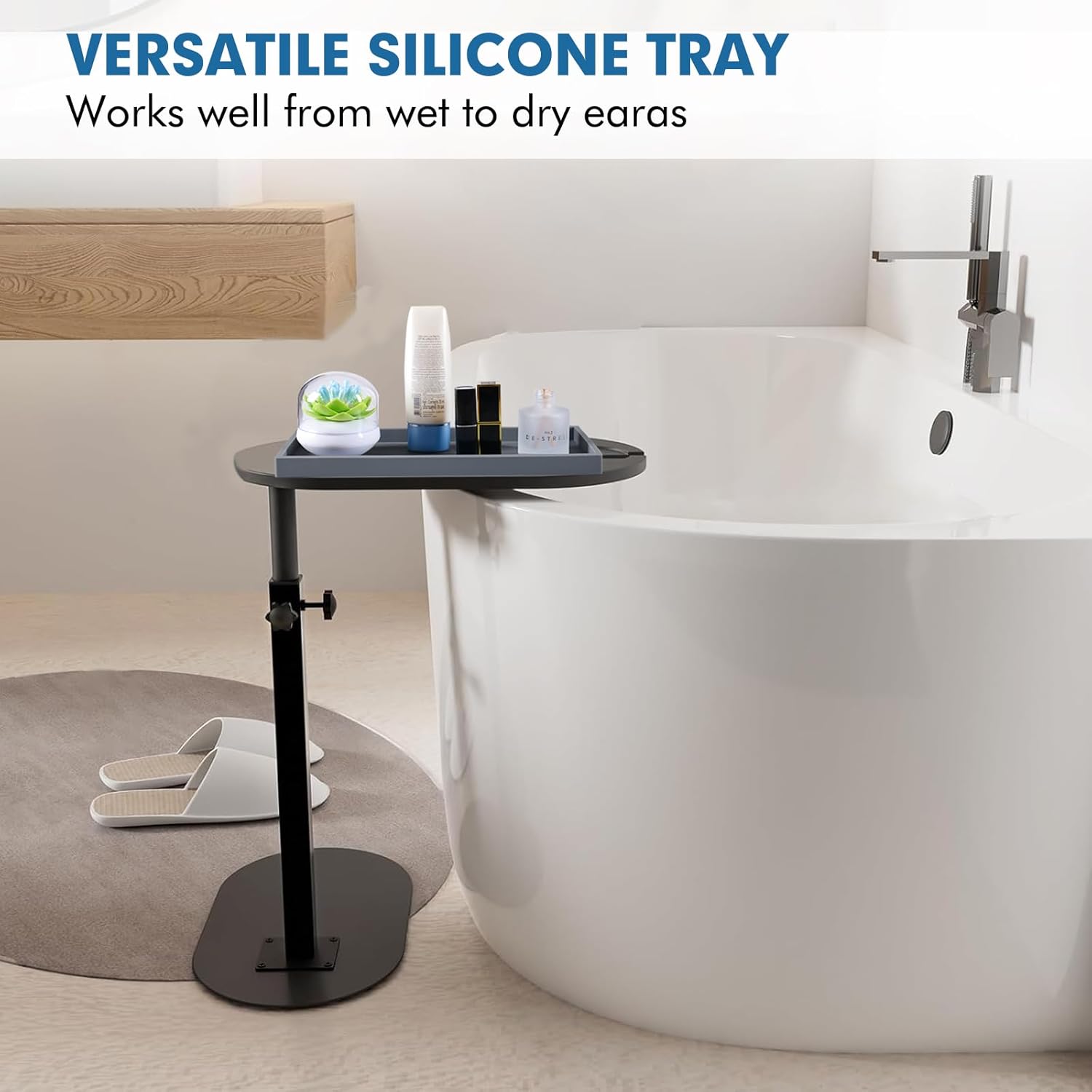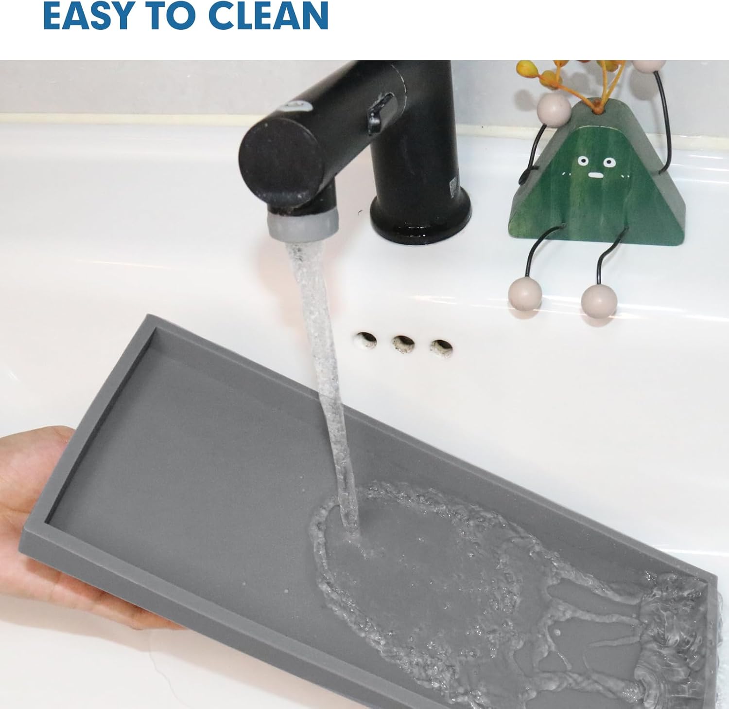 - Batrhoom Counter Tray -- Our silicone counter tray is waterproof and won’t warp, works well in a wet environment. You can use it as a bathroom vanity tray, toilet tank tray, jewelry tray or soap dispenser tray. This bathroom sink organizer will protect your wood shelves from water or soap suds