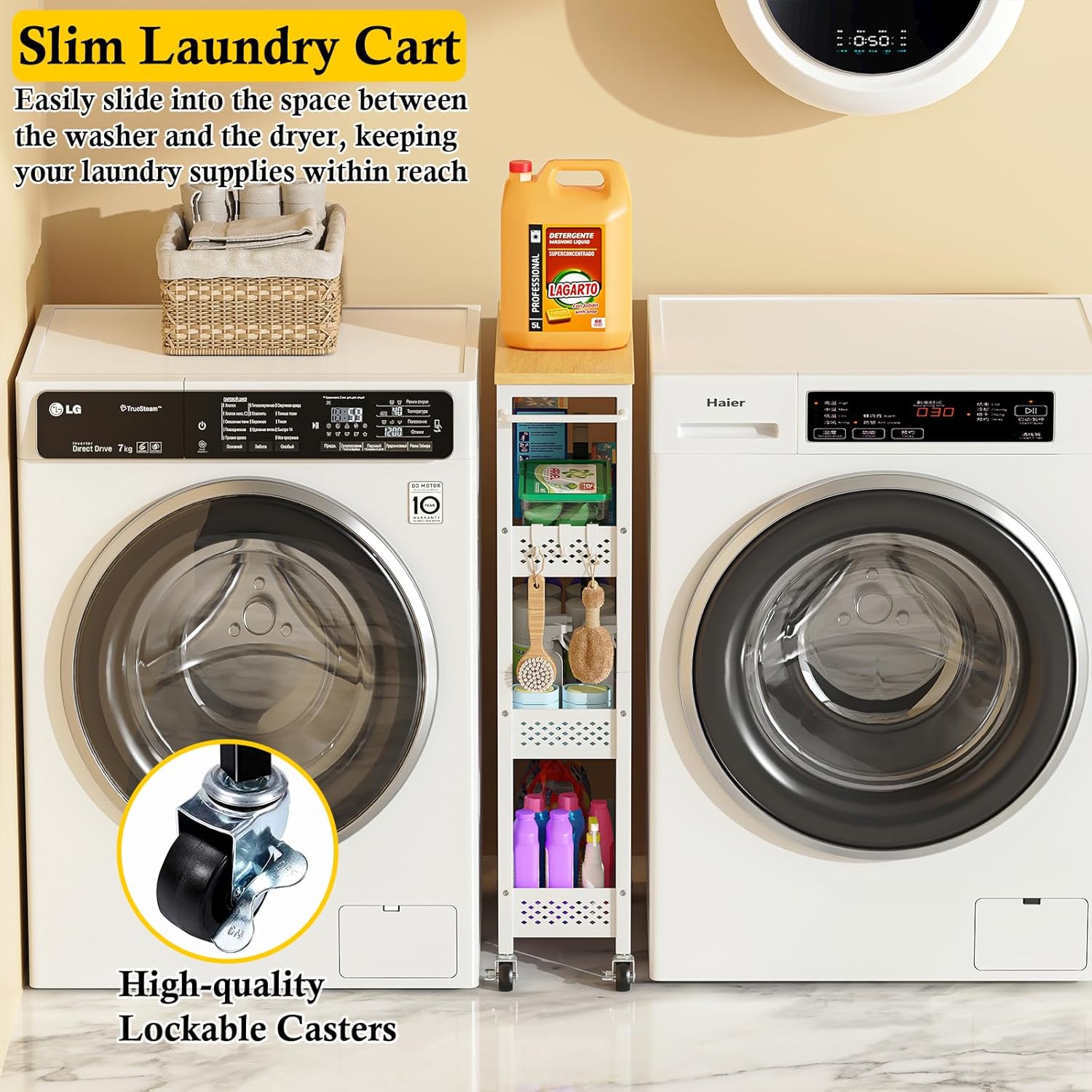 - Durable and Rust-Resistant: Made of premium alloy steel with a powder coating, this slim rolling cart is built to last. The mesh design of the shelf prevents water accumulation, ensuring this laundry room storage cart stays dry even in wet laundry and bathroom areas.