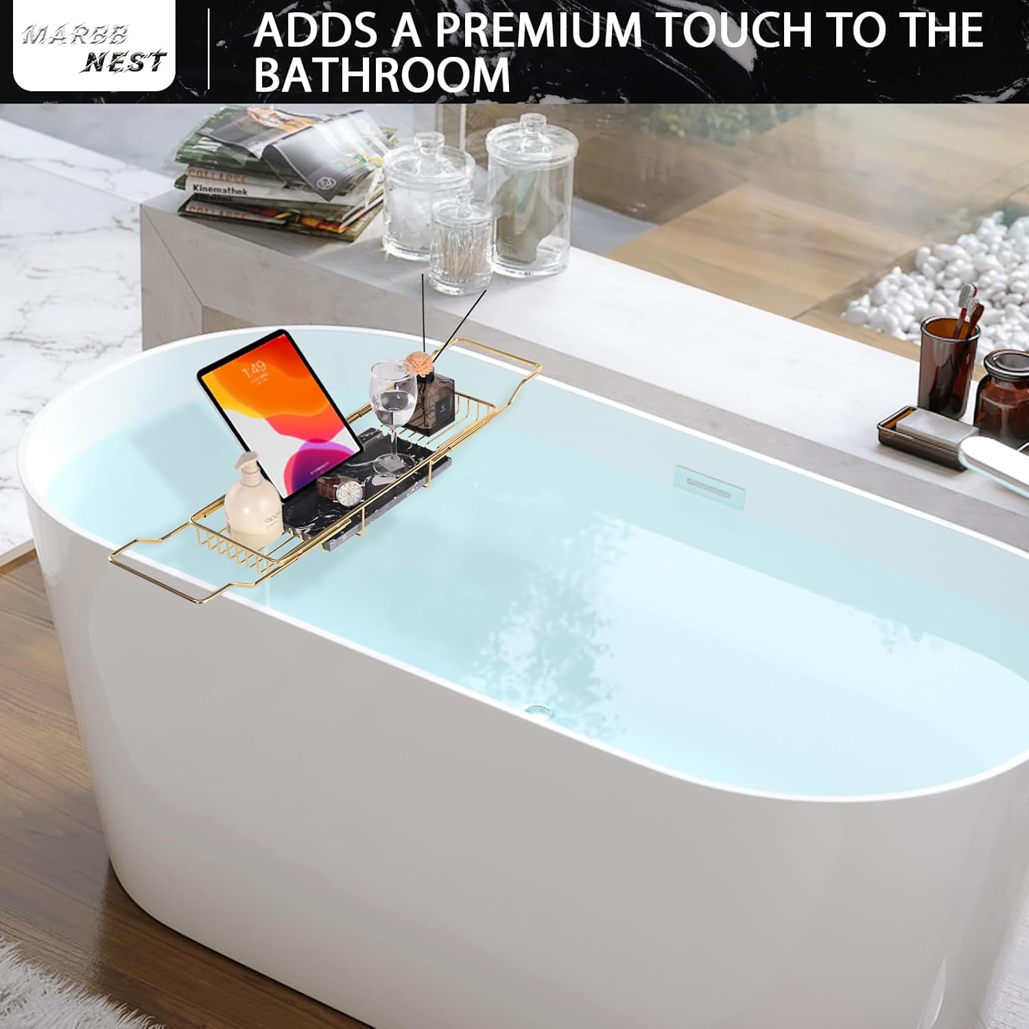 Bathtub Tray Caddy for Luxury Bath Expandable Extra Wide Bath Tub Tray with Natural Marble Tray and Mobile/Tablet Stand, Ideal for Home Spa Lovers (Gold + Black)