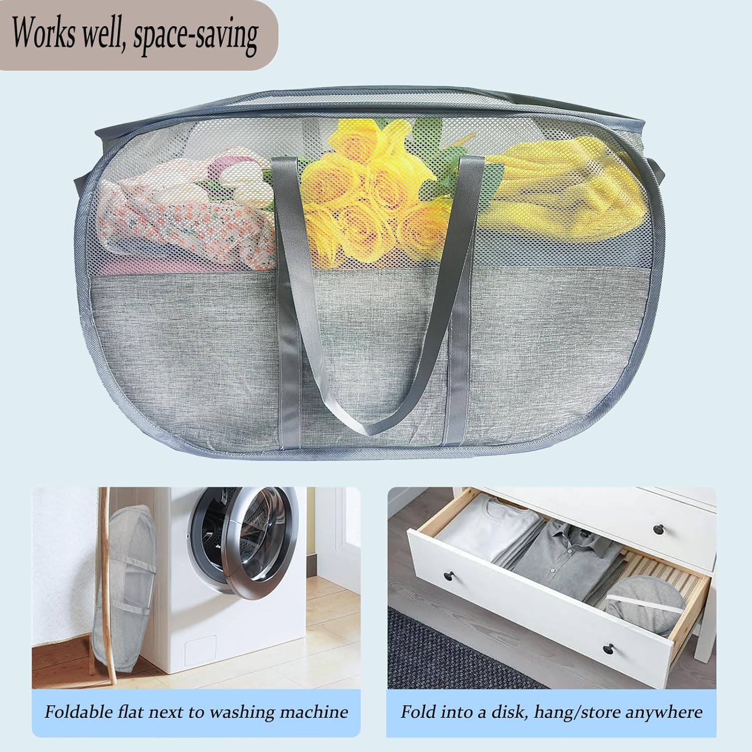 - ๐๐ฎ๐ซ๐๐๐ข๐ฅ๐ข๐ญ๐ฒ ๐๐๐ฒ๐จ๐ง๐ ๐๐จ๐ฆ๐ฉ๐๐ซ๐: Our collapsible laundry basket is meticulously crafted from mesh and cationic fabric, supported by four reinforced elastic steel wires. The seams are double stitched with thick thread. This not only guarantees durability but also boasts superior scratch and wear resistance, ensuring the laundry hamper lasts for ages