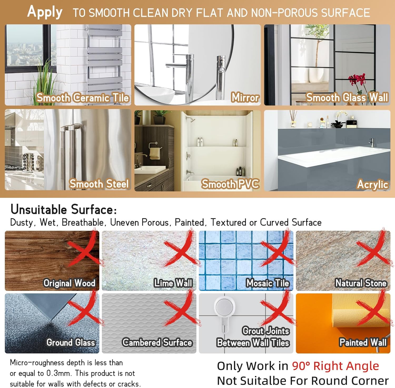 - Warm Tips: Please remind that don't stick this suction cup corner shower caddy to the grout lines. This shower caddy only fits for standard 90°right angle corner. This powerful corner shower caddy works best for non-porous, impermeable, smooth surfaces such as glass, mirror, polished metal, stainless steel, plastic board, wall tile, grainy granite, etc. If problems when firstly installation, please wash the suction cup, dry it with hair dryer and test it on the smooth glass surface. If suction holds, that means initial wall might not applicable for using suction cup, please change installation location
