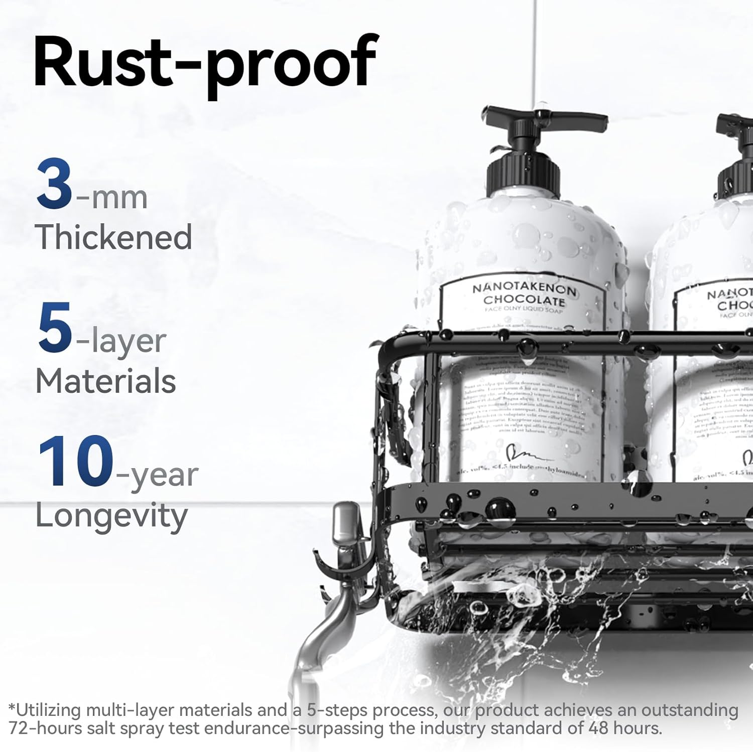 - 100% Rust-Proof: 3mm reinforced wires and 5-Layer rustproof armor coating, survived 72hr ASTM B117 salt spray & 10,000 bend tests. 2X longer lifespan than basic shower shelf for inside shower