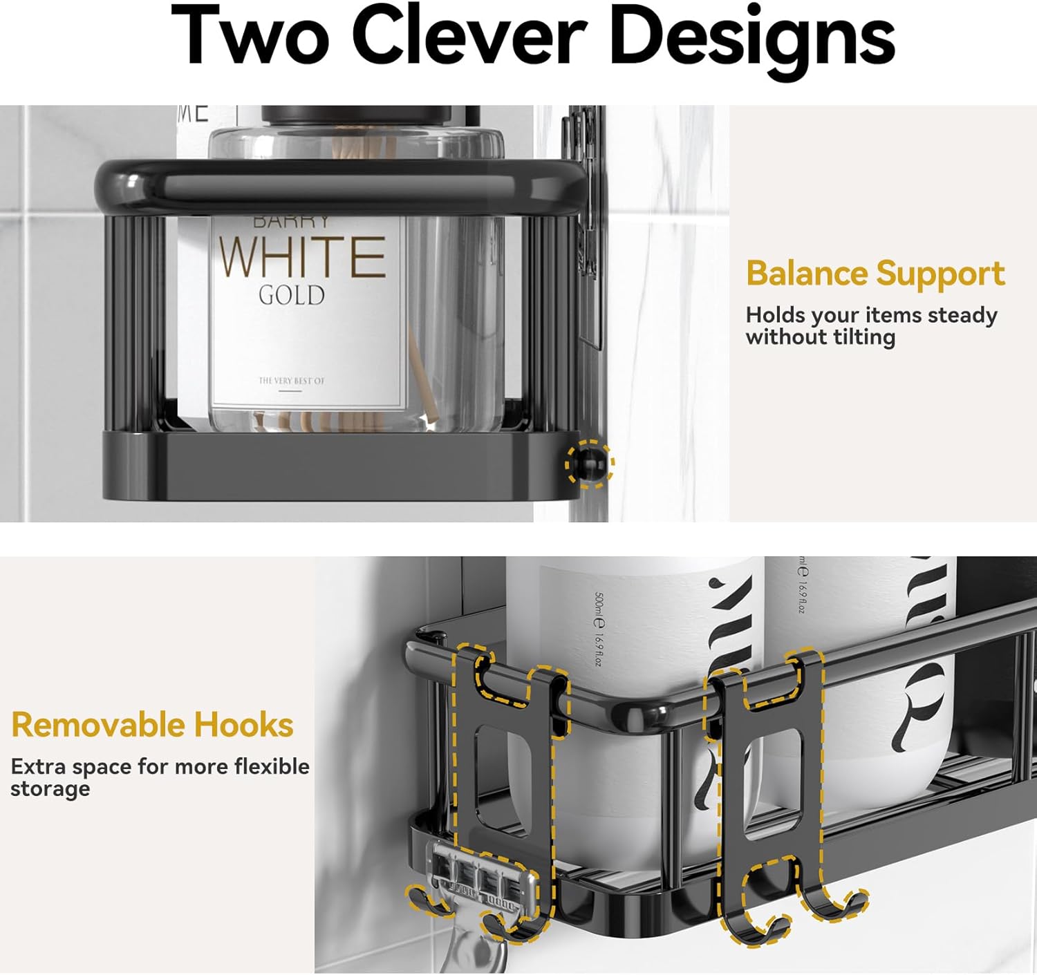 - 40lb Stronghold: lab-verified double-stack adhesive pads, stress-tested to securely hold 40lbs of bath gear with zero sagging, the shower rack has rock-solid stability