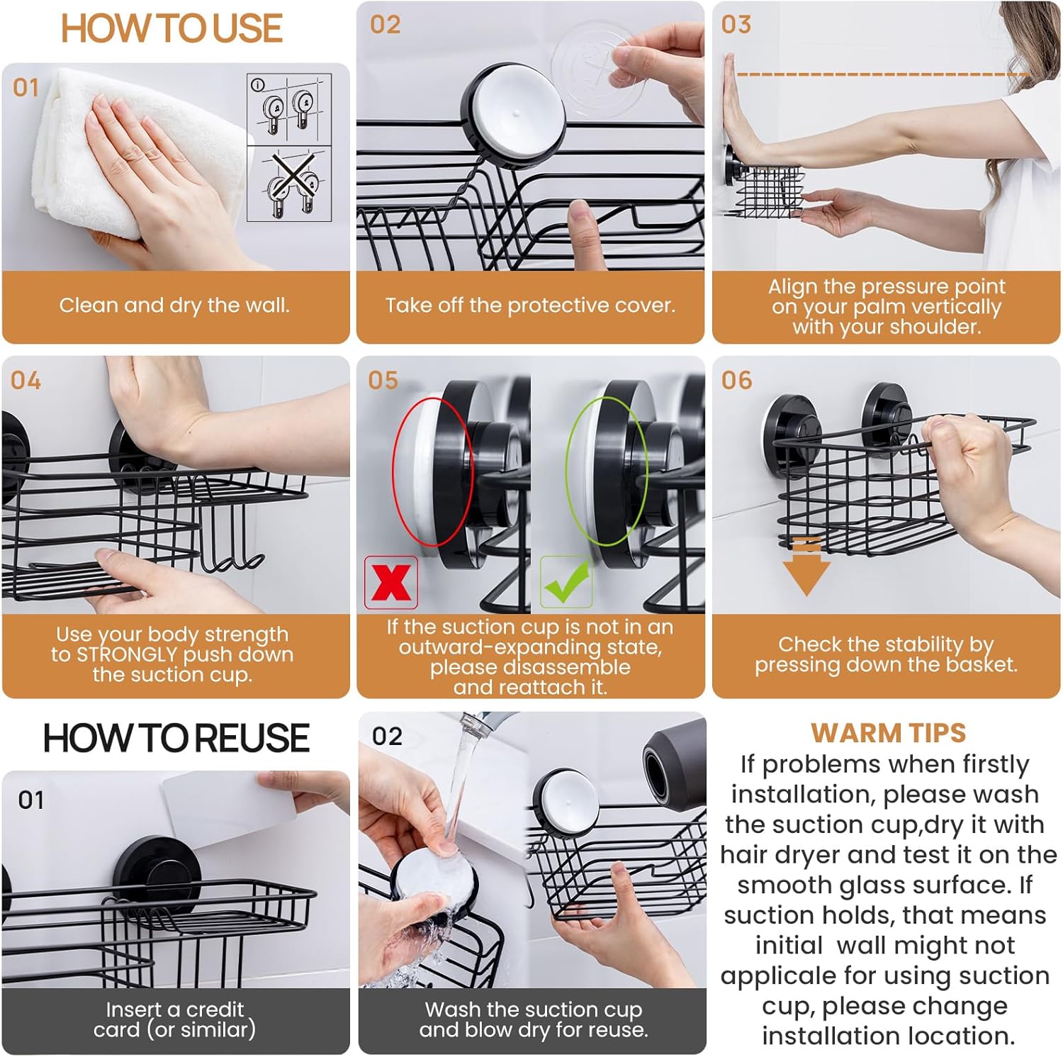 - Warm Tip: This shower organizer works best for non-porous, impervious, smooth surfaces such as glass, mirror, polished metal, stainless steel, plastic board, wall tile, grainy granite, etc. Please remind that don't stick to a grout line. If problems when firstly installation, please wash the suction cup, dry it with hair dryer and test it on the smooth glass surface. If suction holds, that means initial wall might not applicable for using suction cup, please change installation location