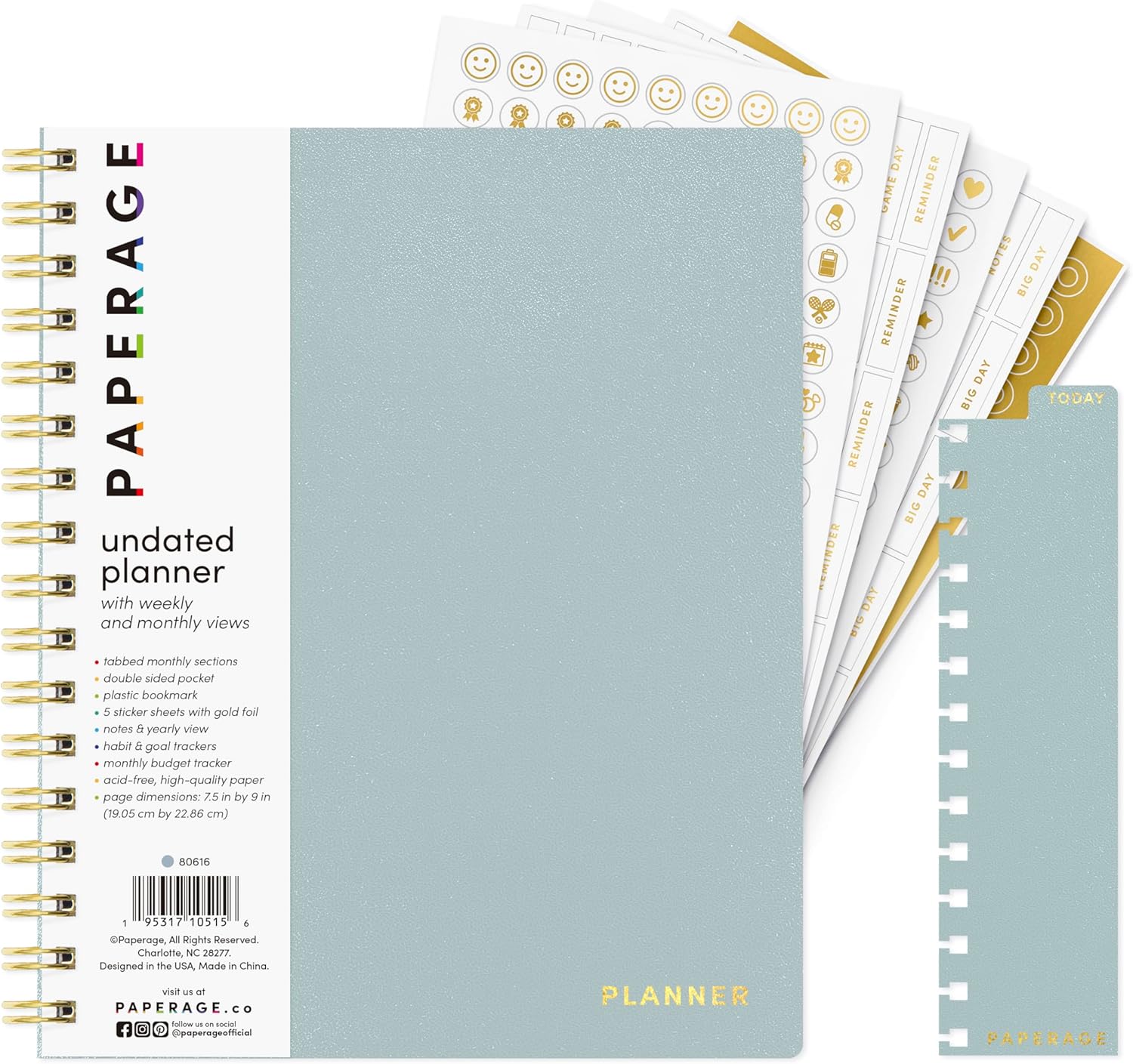 PAPERAGE Undated 12 Month Weekly & Monthly Planner with Durable Cover & Spiral Binding, 7.5 in x 9 in, Productivity Planner with Note Pages, Goals & Budget Trackers, Stickers & Bookmark (Slate)
