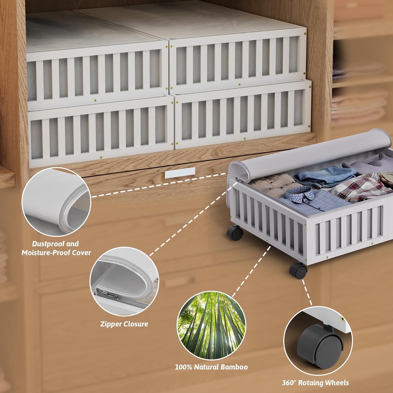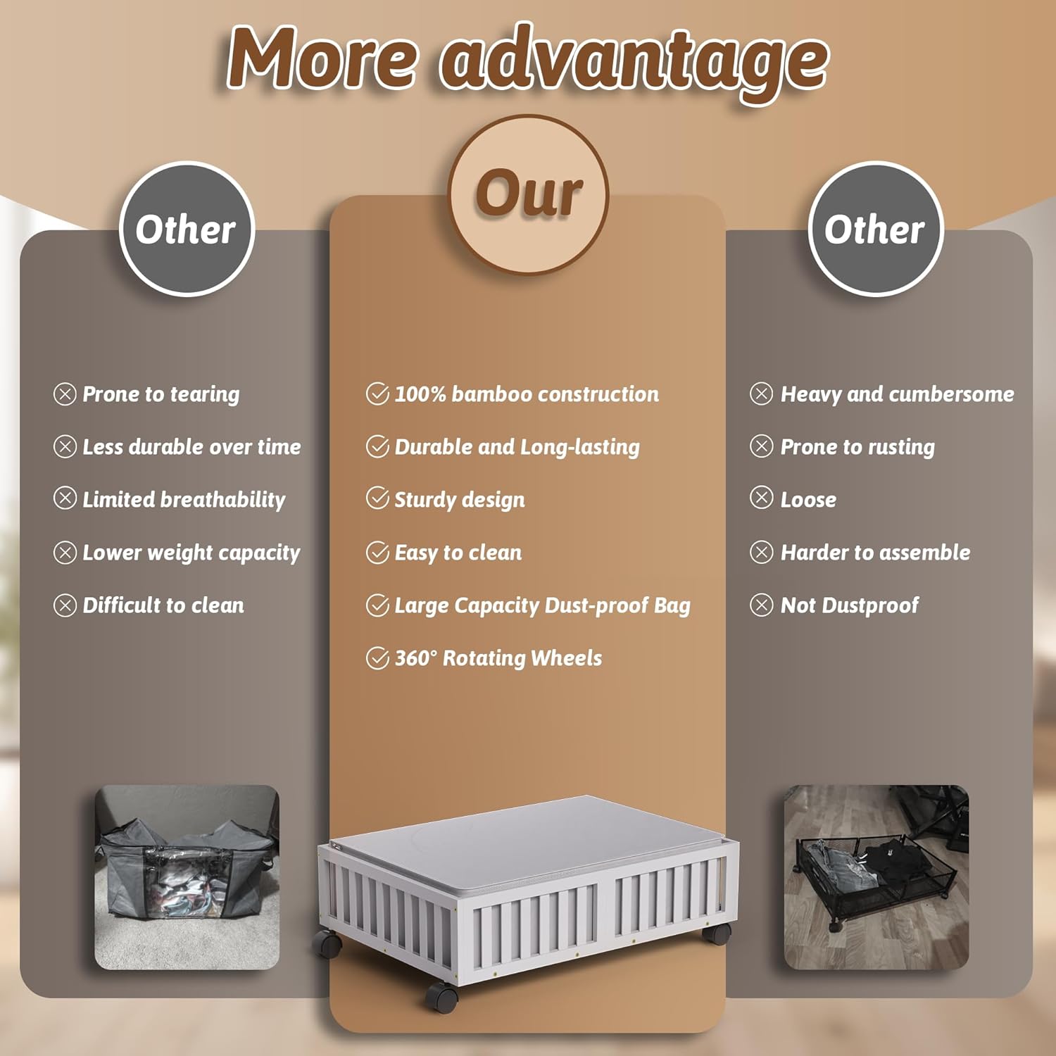 - ๐ฆ๐๐๐ฟ๐ฑ๐ ๐ฎ๐ป๐ฑ ๐๐๐ฟ๐ฎ๐ฏ๐น๐ฒ ๐๐ผ๐ป๐๐๐ฟ๐๐ฐ๐๐ถ๐ผ๐ป: Our under bed drawers on wheels is crafted from 100% Real bamboo, ensuring long-lasting quality and a stylish, natural aesthetic that complements any bedroom decor. Equipped with 4 rotating wheels, each capable of bearing up to 120 pounds. The 48L large-capacity dustproof bag is designed for storing seasonal clothing, bedding, and household items. It's a versatile storage solution that can be customized based to your needs.