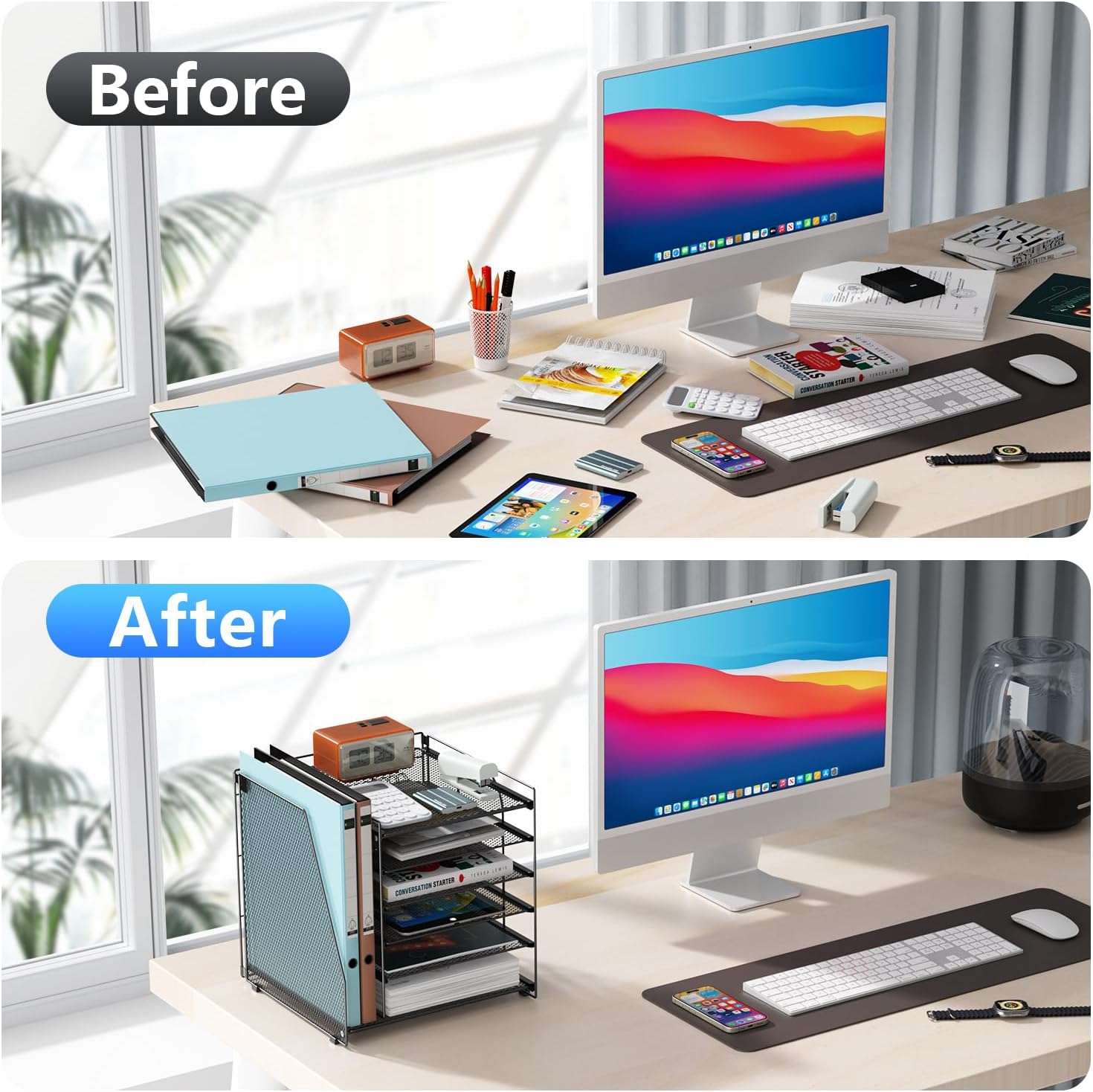 - 【Make the most of your space】This desktop organizer adopts a vertical storage method, which not only saves desktop space but also expands your storage capacity, keeping your desktop tidy and organized.