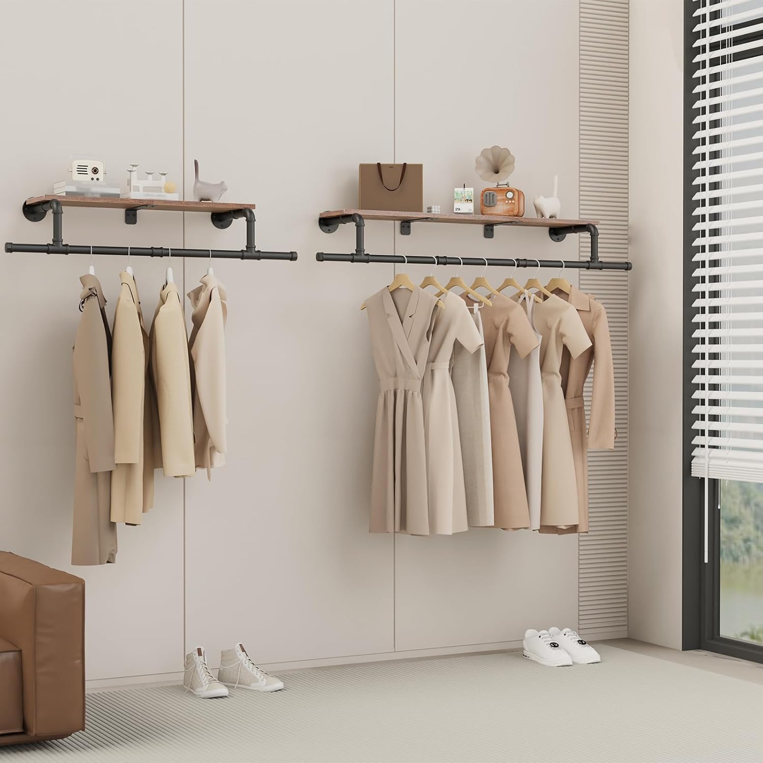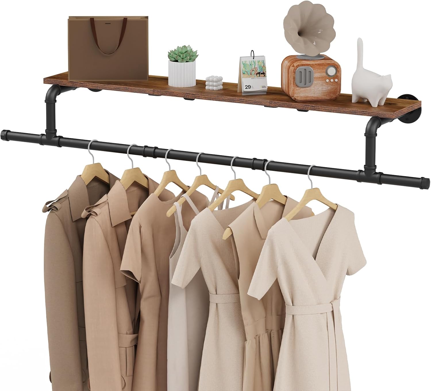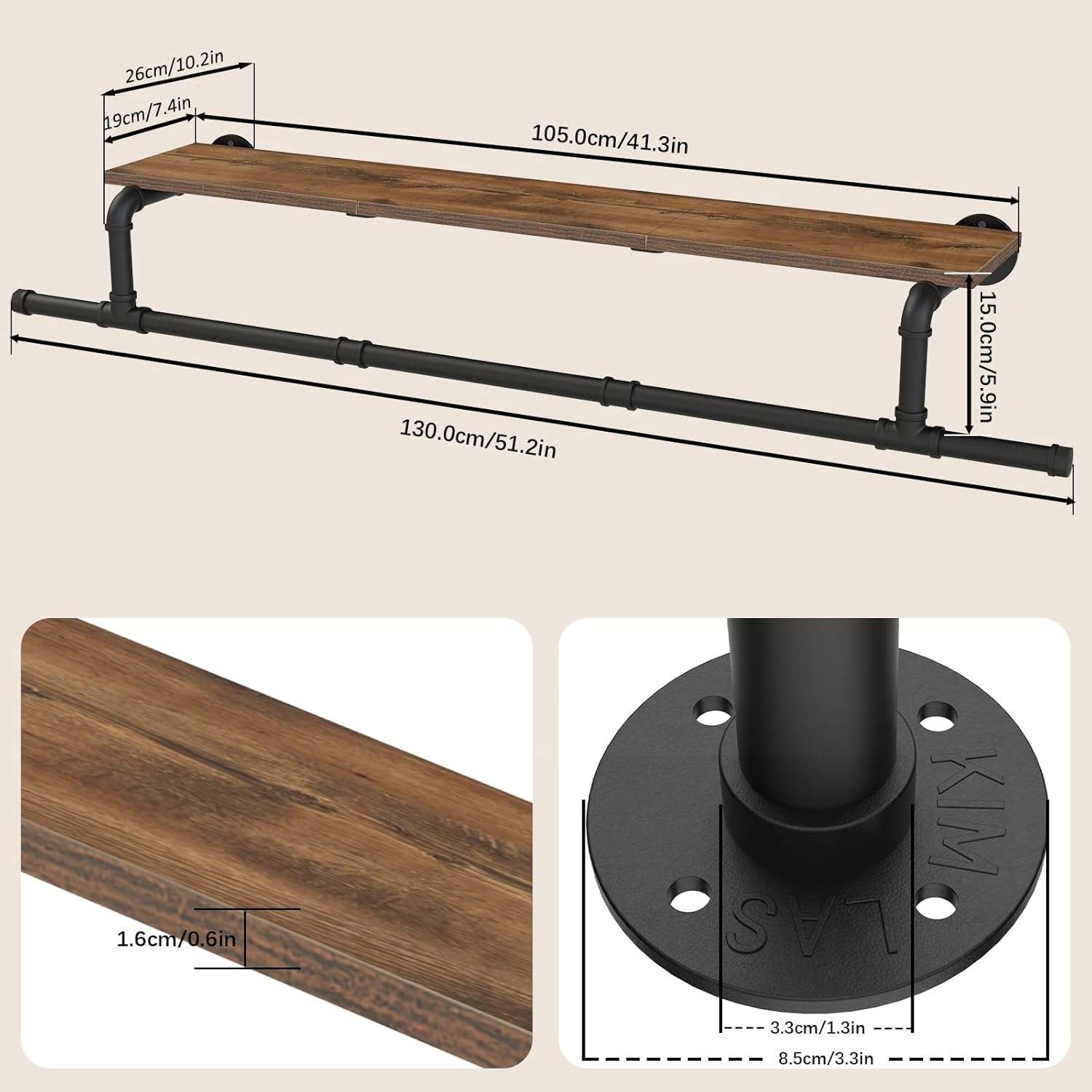 - Industrial Retro Style: The shelf with hanging rod are designed with industrial pipes and solid wood shelves, which are beautiful and fashionable. The unique and retro appearance is suitable for all your rooms and scenes. Whether it's the bedroom, kitchen, living room, or workspace, it can seamlessly blend in and add more fashion to your room