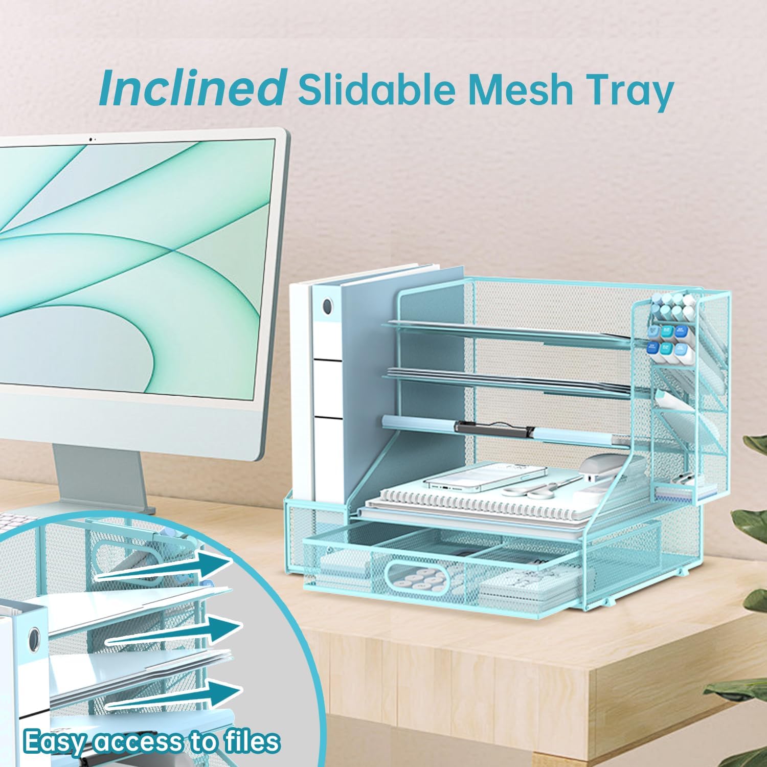 SUPEASY Desk Organizer with File Holder, 5-Tier Mesh Paper Letter Tray Organizer with Pen Holder and Drawer, Desktop Organizer and Storage with 3 Tilted File Sorter for Office Supplies, Blue