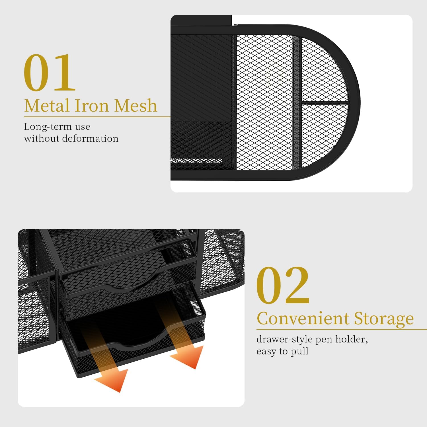 SUPEASY Mesh Desk Organizer, Desk Organizers and Accessories, Pen Holder with Drawers, Pencil Holder for Desk with 2 Drawer for Office Supplies, Black