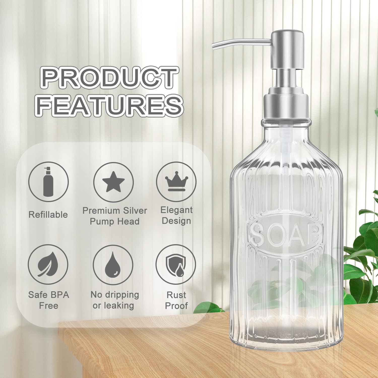 Glass Dish Soap Dispenser - Refillable Kitchen Hand Pump for Rust Proof Stainless Steel Countertop, Clear Liquid Bathroom Dispenser