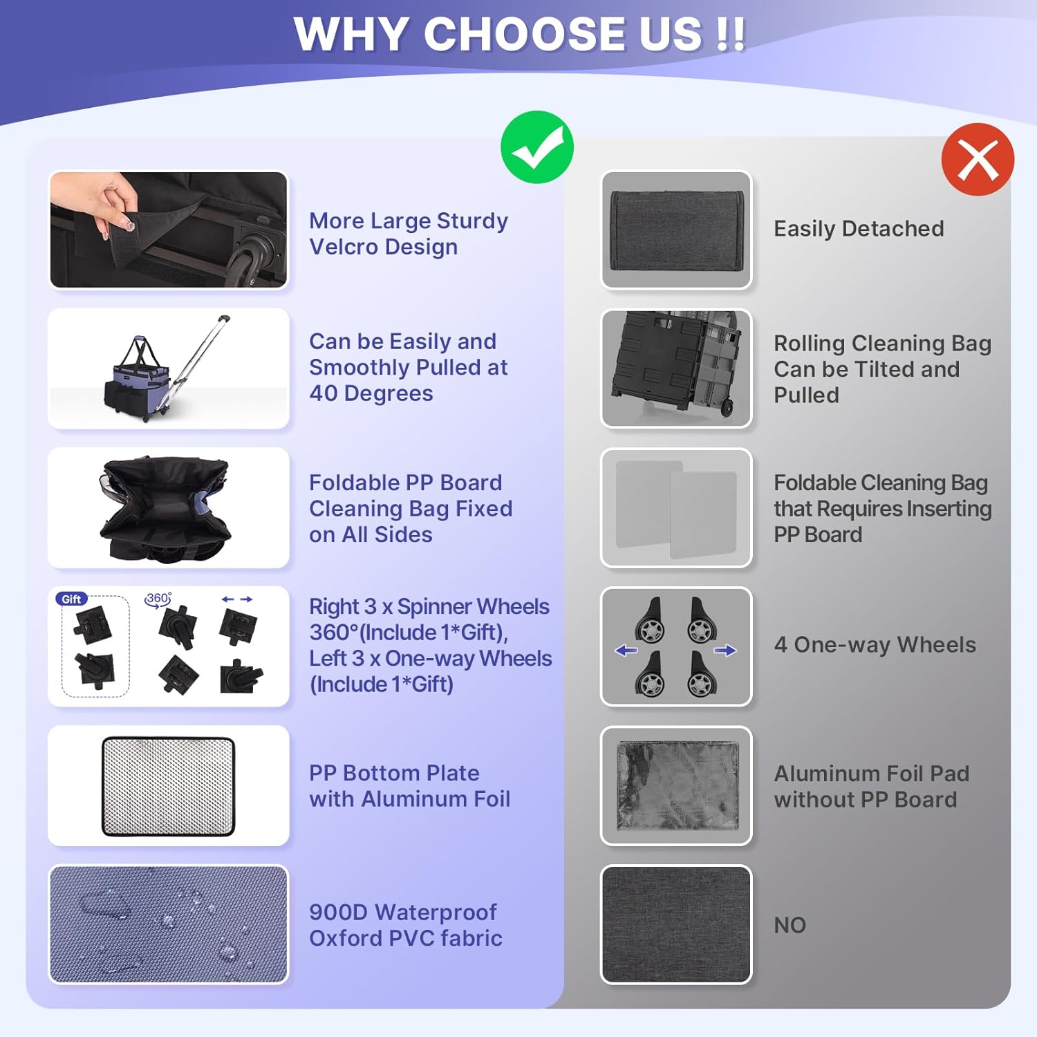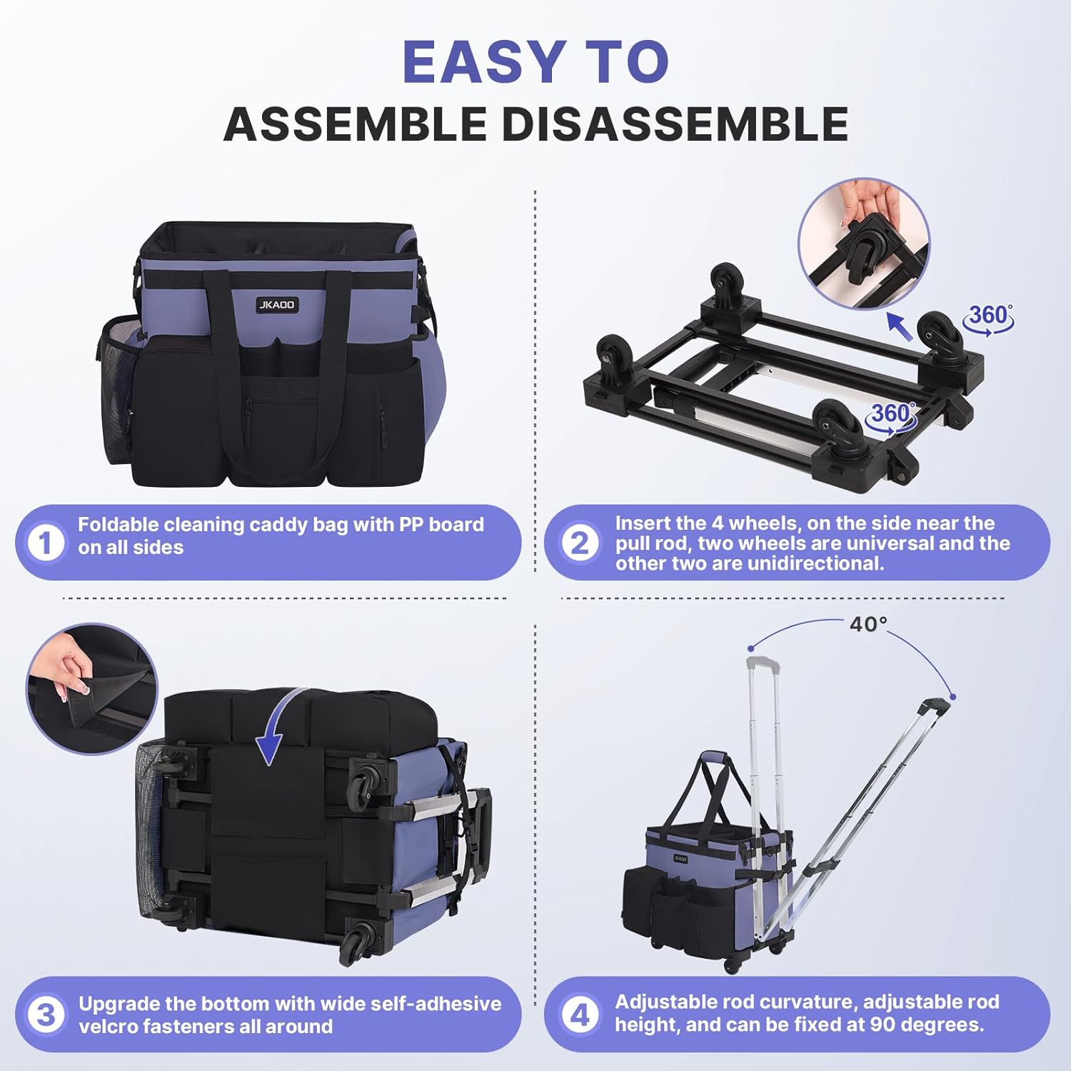 - 【90 °& 40 ° Adjustable Rolling Cleaning Caddy Bag】Rolling cleaning bag comes with 1 detachable shoulder strap and fixed double handles, both padded, it also comes with a detachable cart with 4 detachable inserted wheels (2 spinner wheels 360 °, 2 one-way wheels), and 2 extra wheels for later replacement. A 90 °& 40 ° adjustable pull bar is more agile than a traditional trolley and provides a more portable service