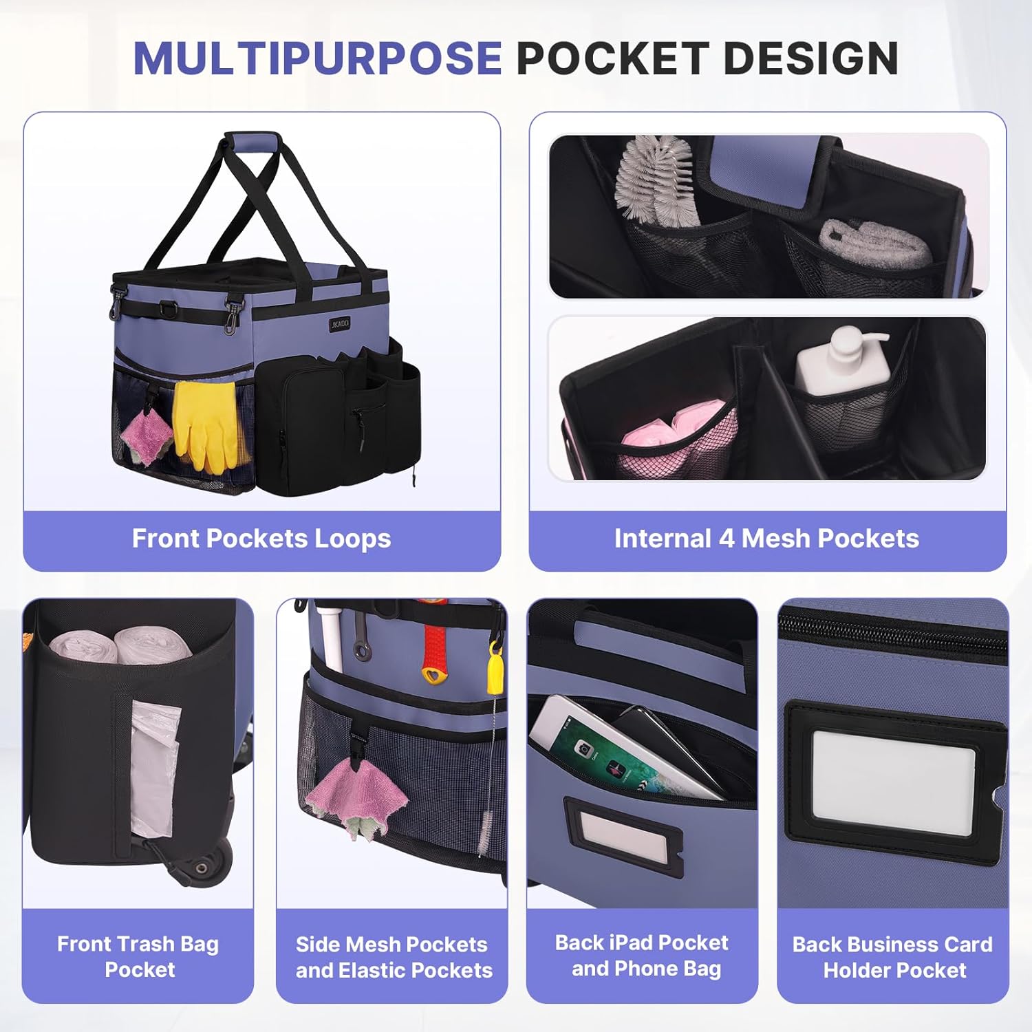 - 【Upgrade Material, Waterproof, Easy to Clean】The JKAOO cleaning supplies caddy is a long-lasting, waterproof cleaning bag made of 900D Oxford fabric with PVC coating. It features a detachable double-sided aluminum foil PP plate pad at the bottom for easy cleaning. The side mesh pockets are breathable and scratch-resistant. The wiring is compact, and the wire thickness is 2-3 times that of ordinary mesh, making your life easier and improving your cleaning experience