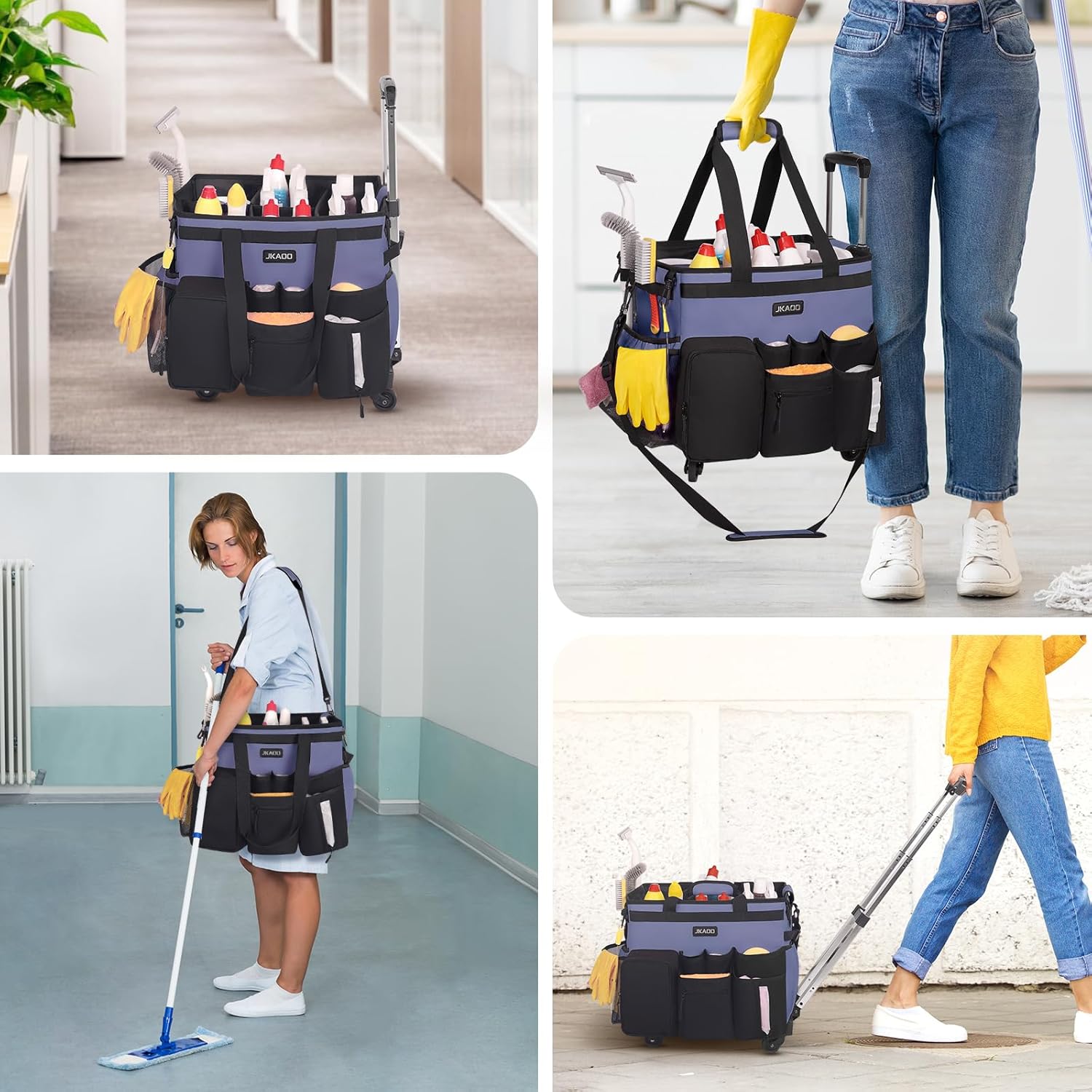 - 【Collapsible Support Panel, Quick Storage】The JKAOO rolling cleaning caddy bag has foldable PP boards on both sides, and support boards on all sides, and the shape is spacious and sturdy. It features 4 large Velcro buckles on bottom to secure the bag to the pole platform and bag side's cross-bar fixed design to prevent collapsing or tilting when filled with cleaning tools. The 4-level telescopic double rod handle can be adjusted to a maximum of 38.2 inches / 97 cm to meet push-pull requirements