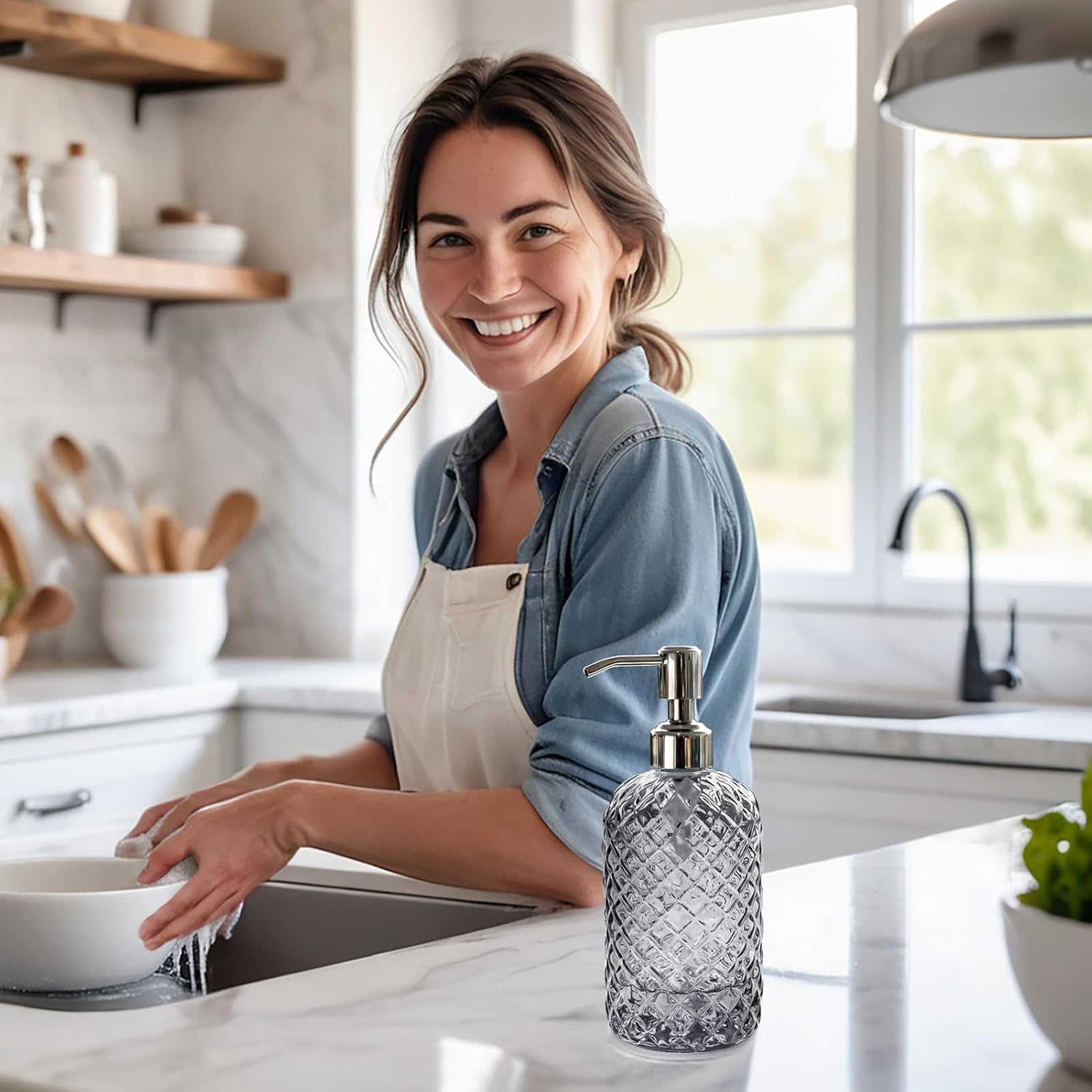 - Stylish Glass Soap Dispenser With Durable 304 Stainless Steel Pump for Long Lasting Brightness And Rust Proof, Great for Dispense Your Favorite Hand Soap & Dish Soap Smoothly in Your Kitchen Sink.