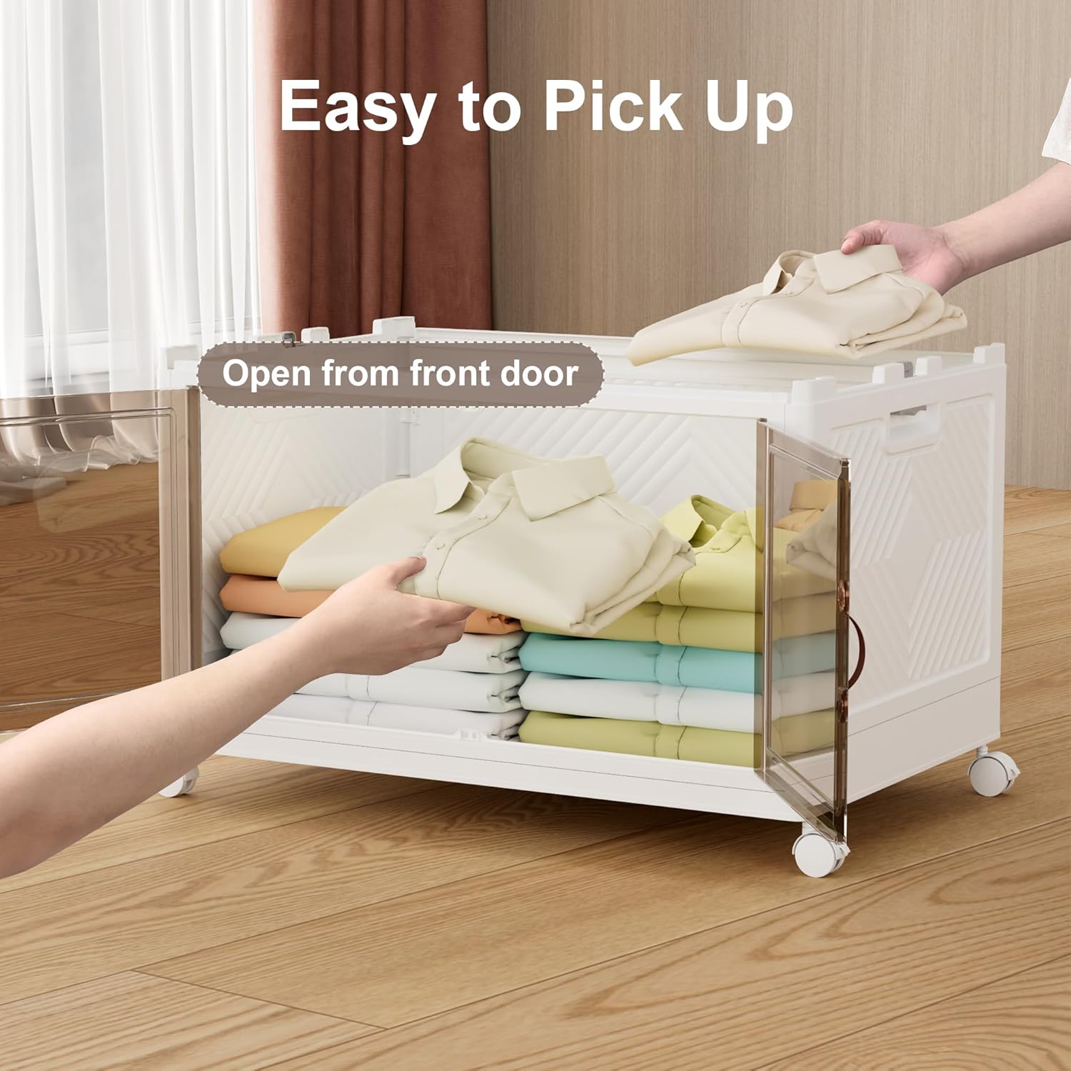 - [Easy to Move] The collapsible storage box is made of high-strength PP material, which is very durable. Four rotating wheels are installed at the bottom, so that it can move when cleaning, more convenient for you to clean