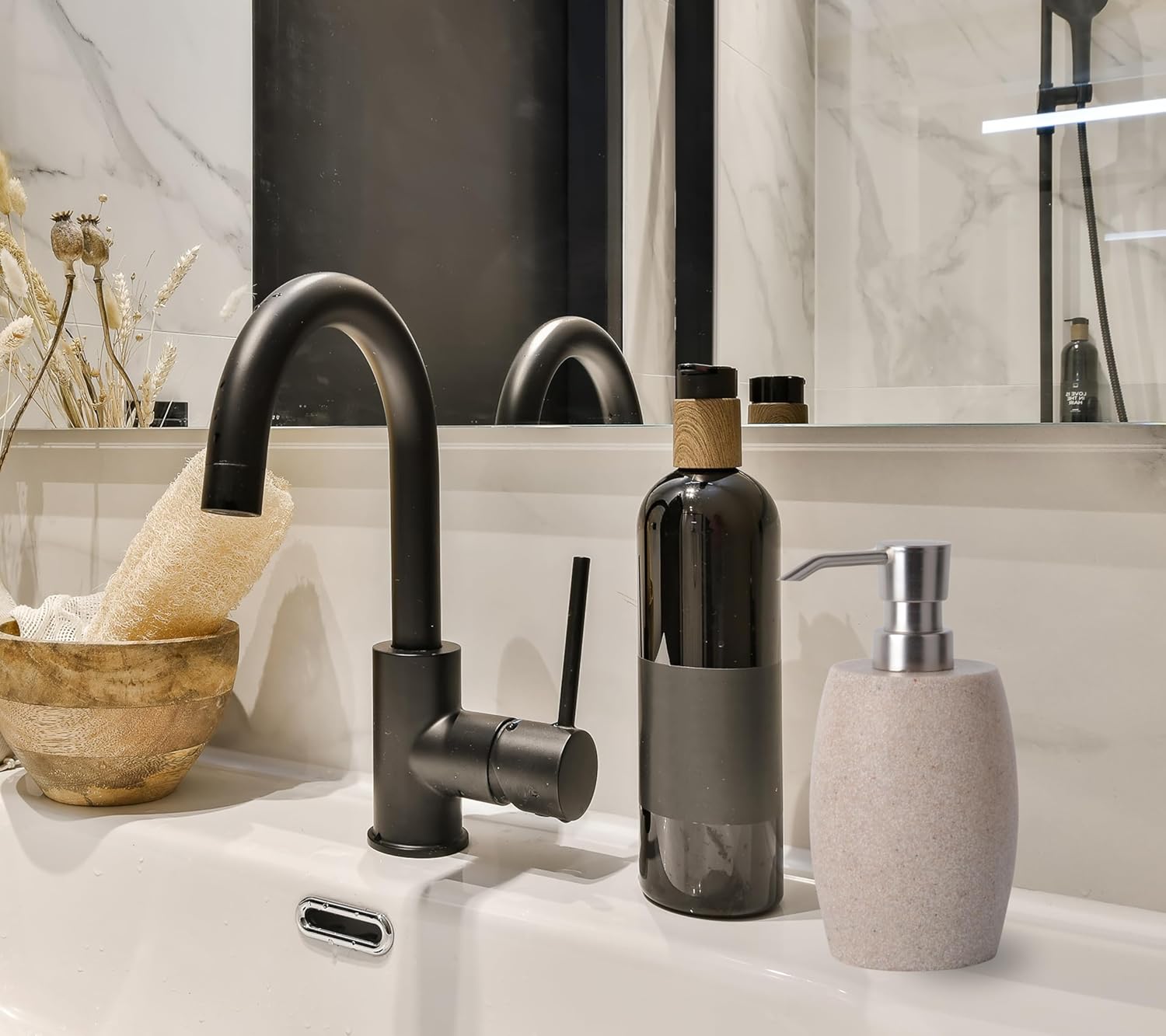 - 【CARE INSTRUCTIONS】To maintain your bathroom soap dispenser's longevity, gently clean with a damp cloth or rinse with water. Avoid rough cleaning products that could damage the surface and protect it from direct sunlight to preserve its aesthetic appeal and functionality.