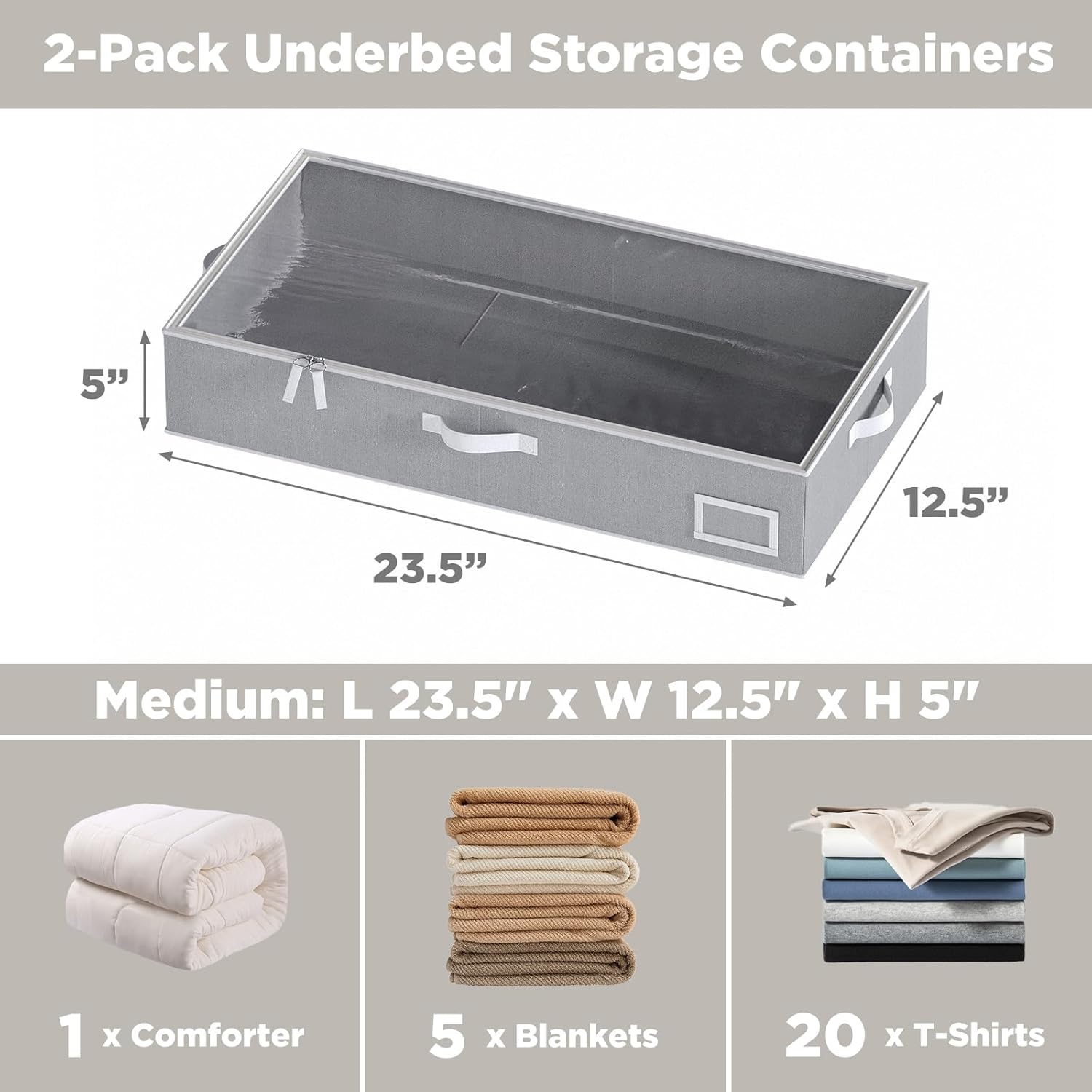 Under Bed Storage, Under Bed Storage Containers Bins for Clothes, Large Linen Underbed Closet Organization Bins, 2 Pack Collapsible Underbed Bin Dorm for Clothes, Sweater, Gray