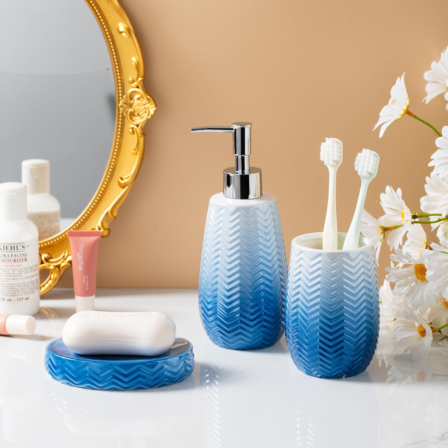 Bathroom Accessory Set,Blue Bathroom Decor,Blue Soap Dispenser, Soap Dish and Tumbler,Wavy Bathroom Accessories Complete Set