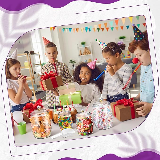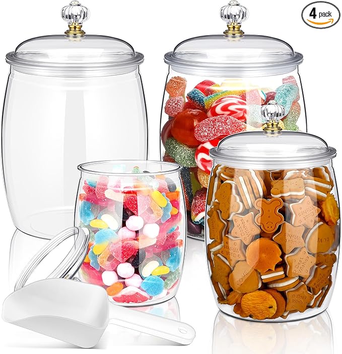 - Package Content: this pack includes 4 clear jars with lids; Each candy storage jar comes with a lid, making it ideal for those who frequently bake or entertain; The pack efficiently accommodates assorted goodies, enough quantity to meet your various requirements; Note: this product is made of plastic; Please confirm the material before purchasing