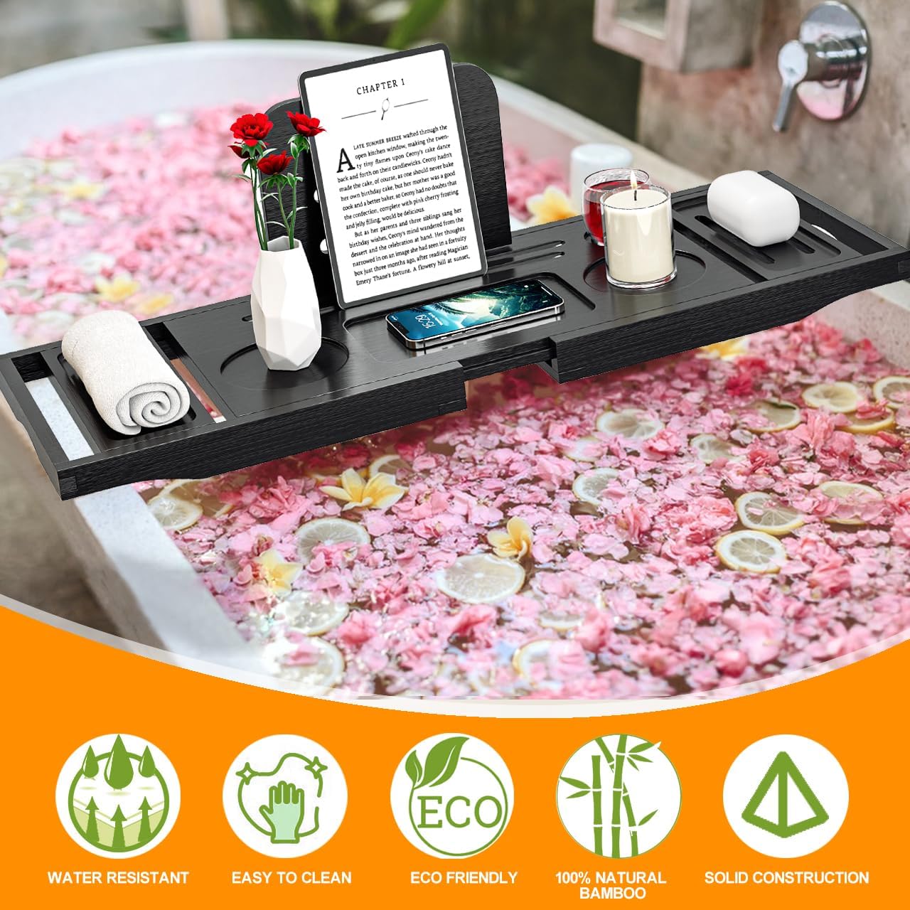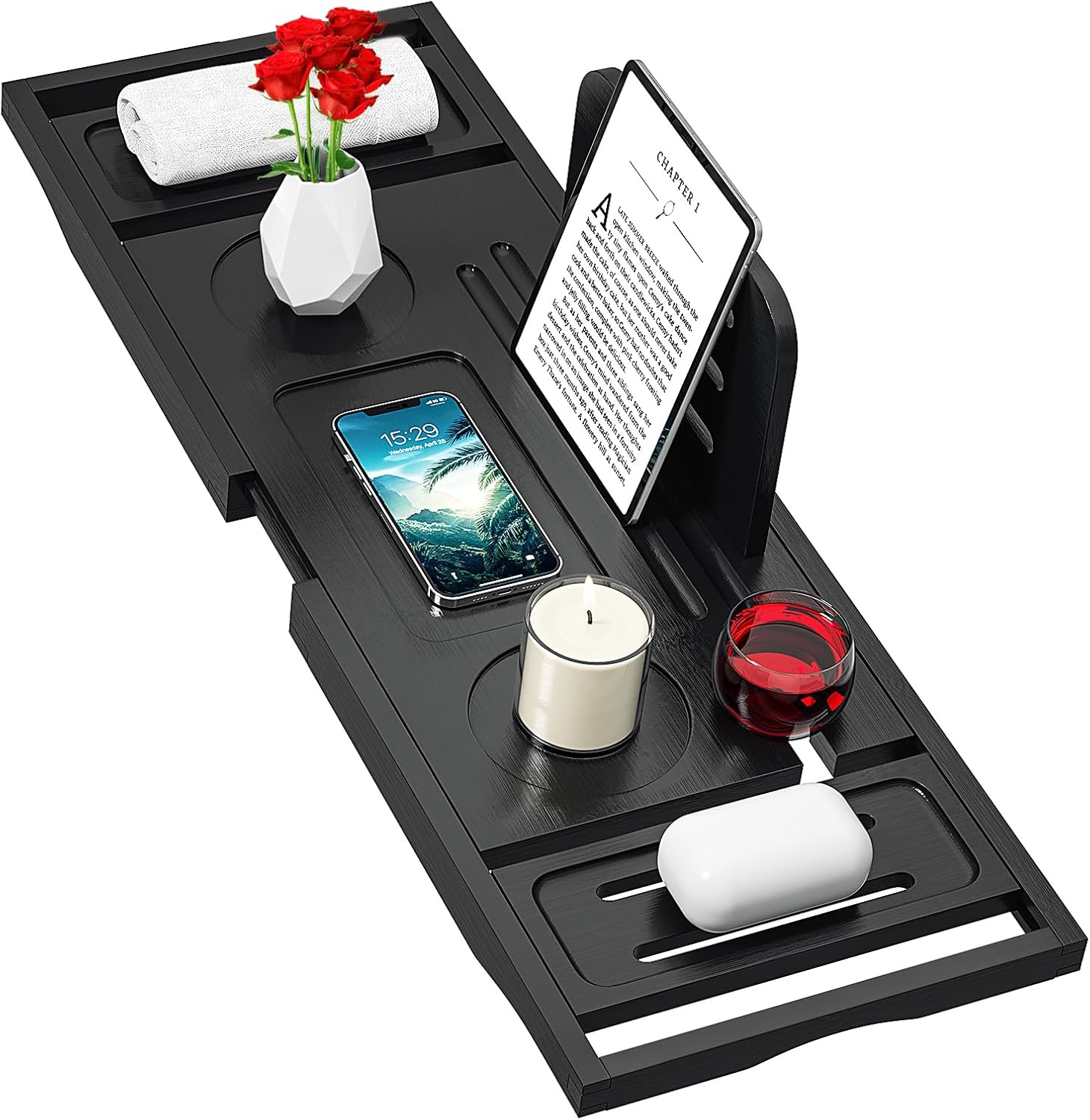 Bathtub Tray Caddy Black- Bath Tray Black - Bath Tub Tray Caddy - Bamboo Bath Tray for Tub - Expandable Size, Fits Most Tubs
