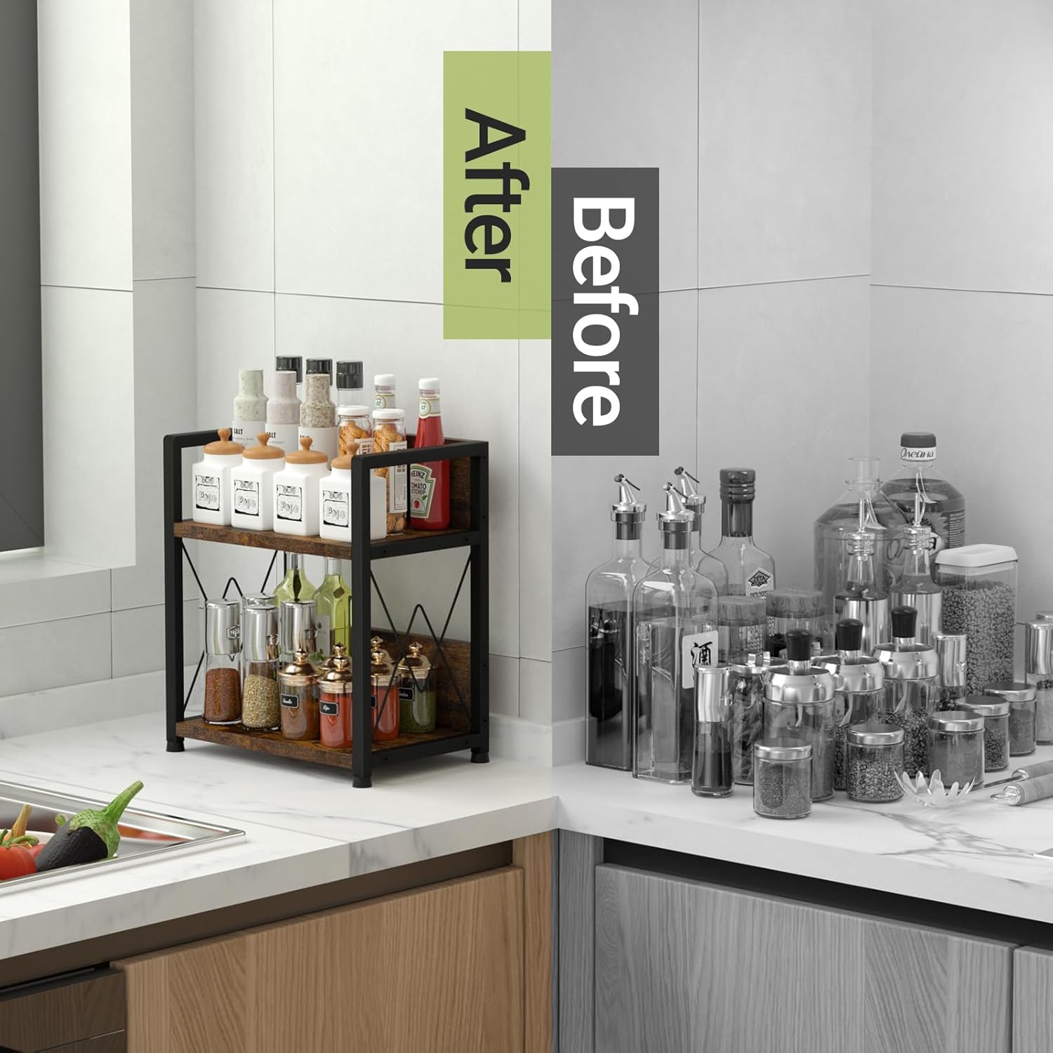 - Efficient Space-Saving Design: The two-tier structure of this kitchen counter organizer provides ample storage for all your coffee bar essentials and spice shelf items, making it a versatile addition to any countertop, whether as a coffee station organizer or a general countertop storage solution