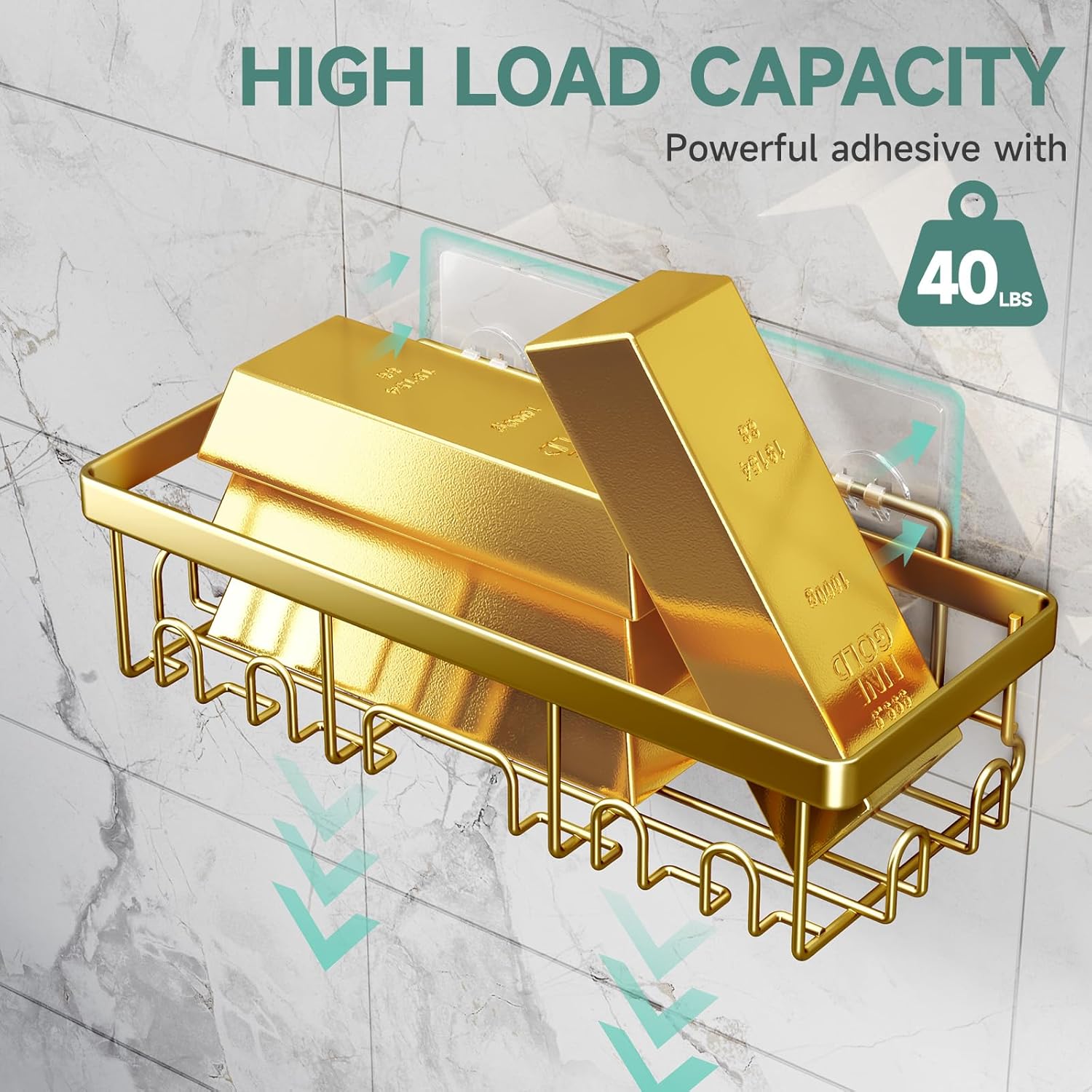 Veken Adhesive Shower Caddy 6-Pack,Gifts for Women Mom,Heavy Weight Bearing,Large Wall Mounted Bathroom Shelves Rack,Organizer Storage Accessories with Soap Dish&Toothbrush Holder,Bright Gold