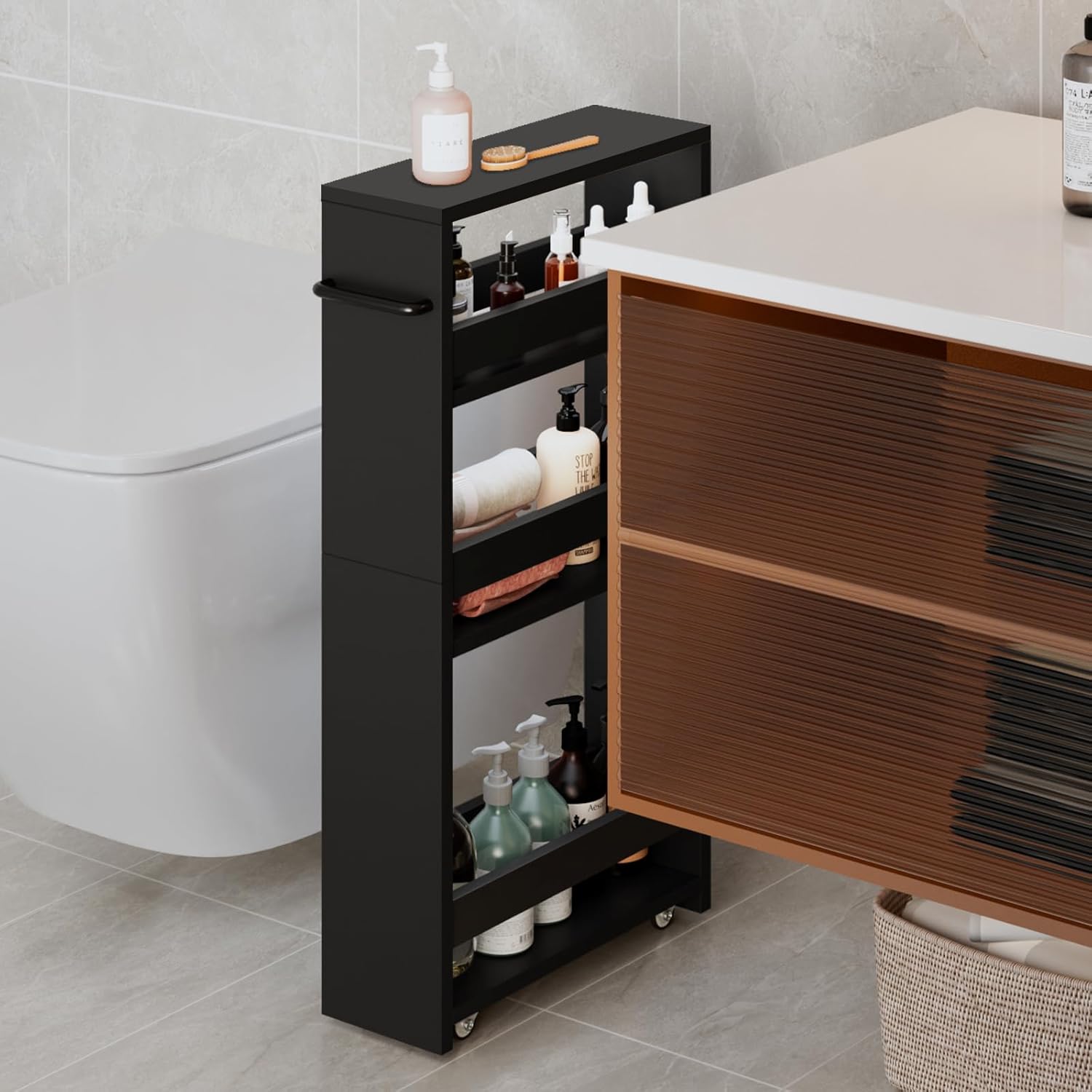 MARTY Slim Rolling Storage Cart 4-Tier Kitchen Cart with Wheels, Laundry Room Storage with Handle Slide Out Utility Cart Shelving Unit Organizer Trolley for Narrow Places Bathroom Small Corner, Black