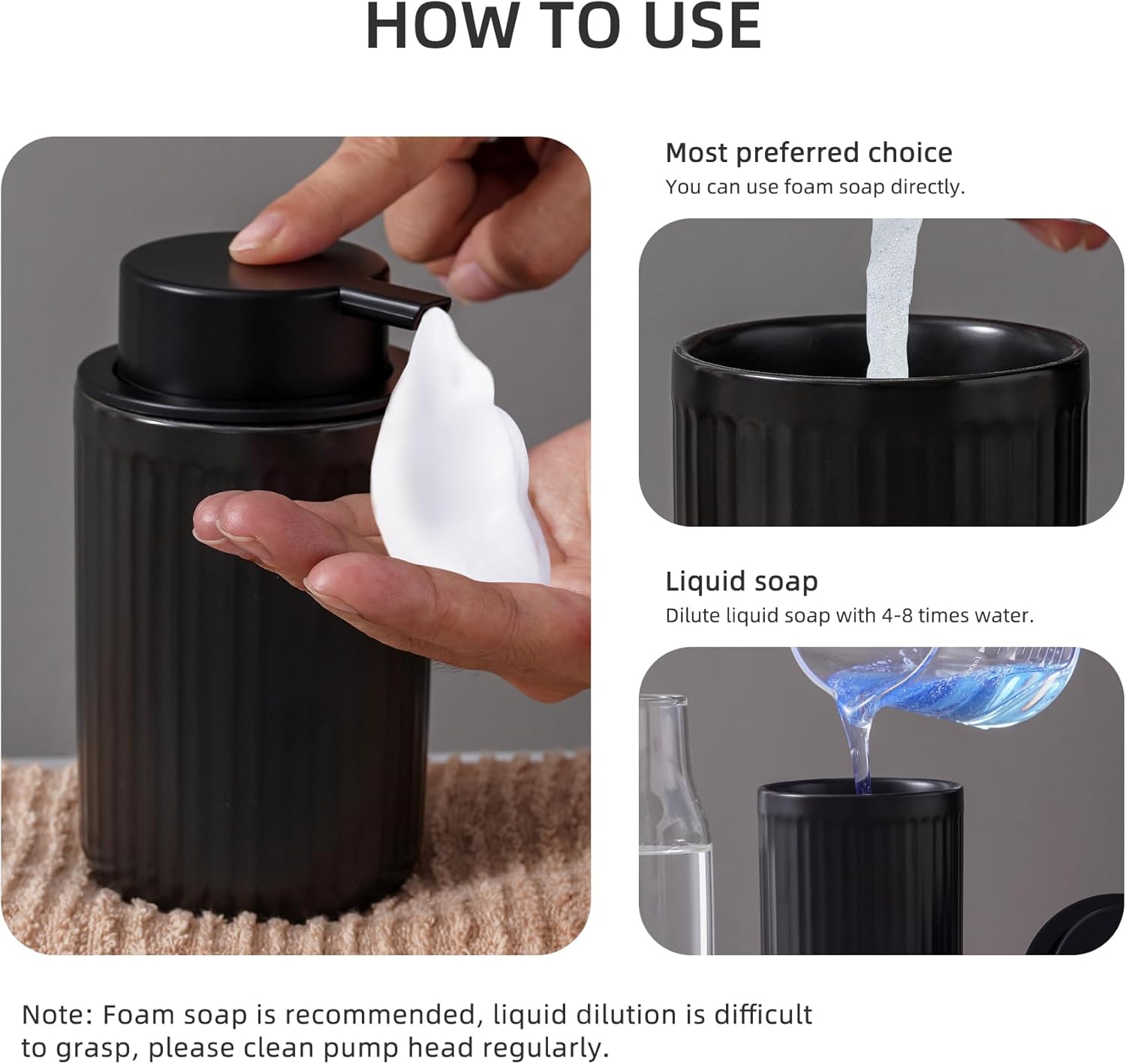 - Ceramic Foam Soap Dispenser :Can be filled with a variety of daily use foam soaps, or liquid soaps (Please dilute the liquid lotion with 4-8 times water and stir well.)Allows you to use less soap while producing more lather. Foaming detergent is recommended.