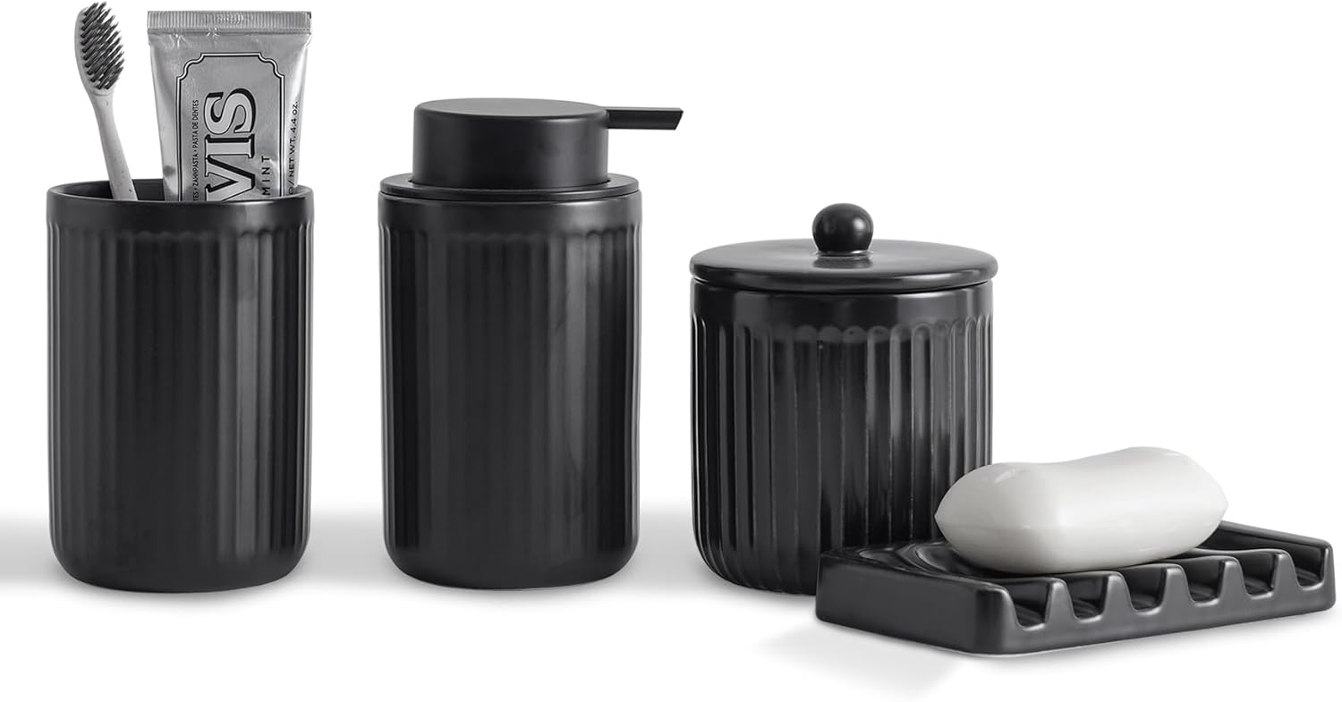 - Space Saving Design:Each accessory in this bathroom set is carefully designed to optimize your bathroom countertop space and keep it neat and organized. Portable and easy to use at home. This bathroom accessory set features a modern and elegant design, making it a highlight in your bathroom décor.