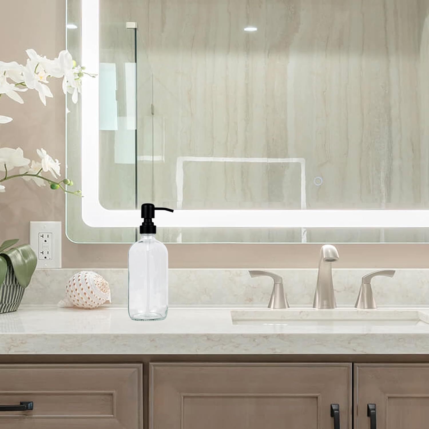 - Elegant Design:Amber glass bottle with black stainless steel pump, simple and stylish appearance, better decorate your kitchen, bathroom and other places that need soap dispenser.