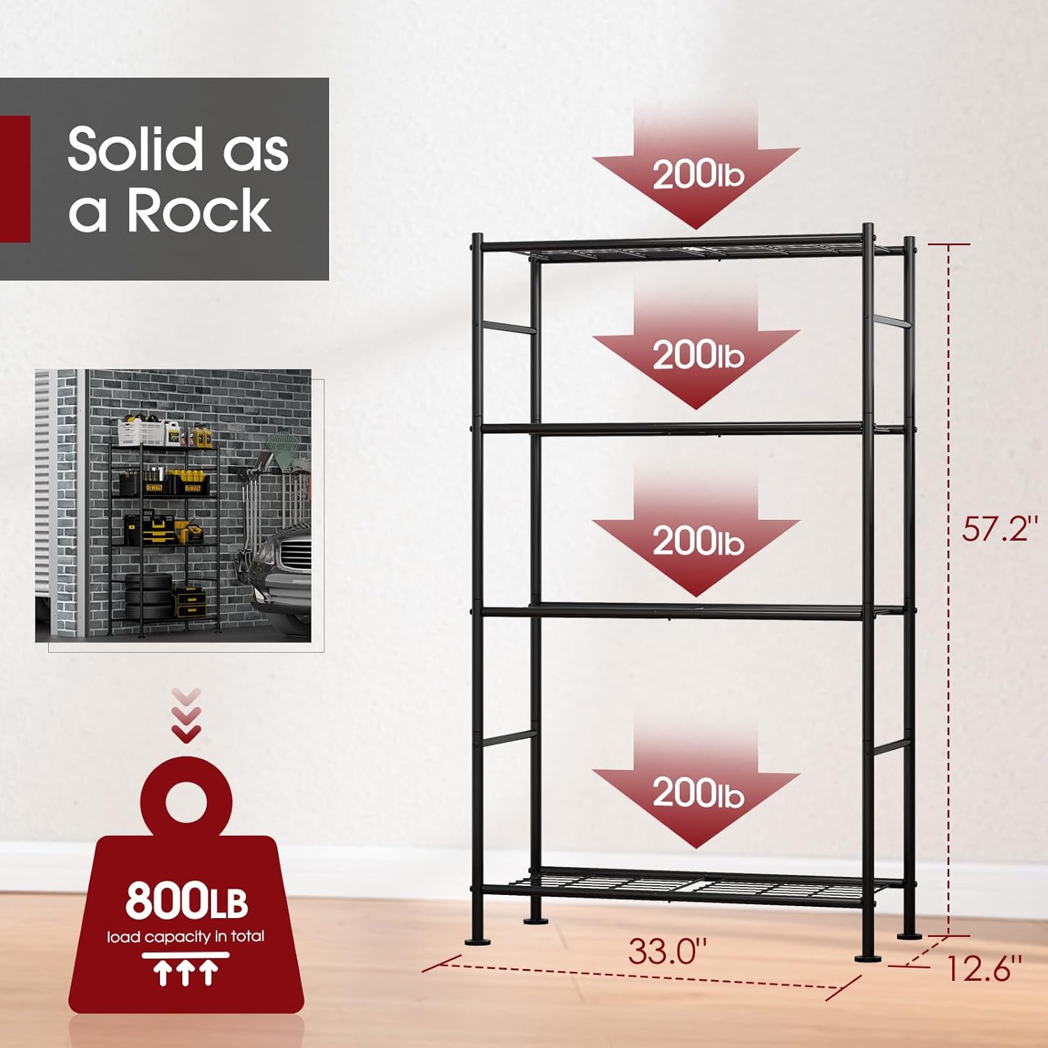 Storage Shelves - 4 Tier Shelf Organizer, Heavy Duty Garage Shelving Unit with Leveling Feet, Stable Metal Shelves Organizer for Pantry, Kitchen and Closet, 33.0" W x 12.6" D x 57.2" H, Black