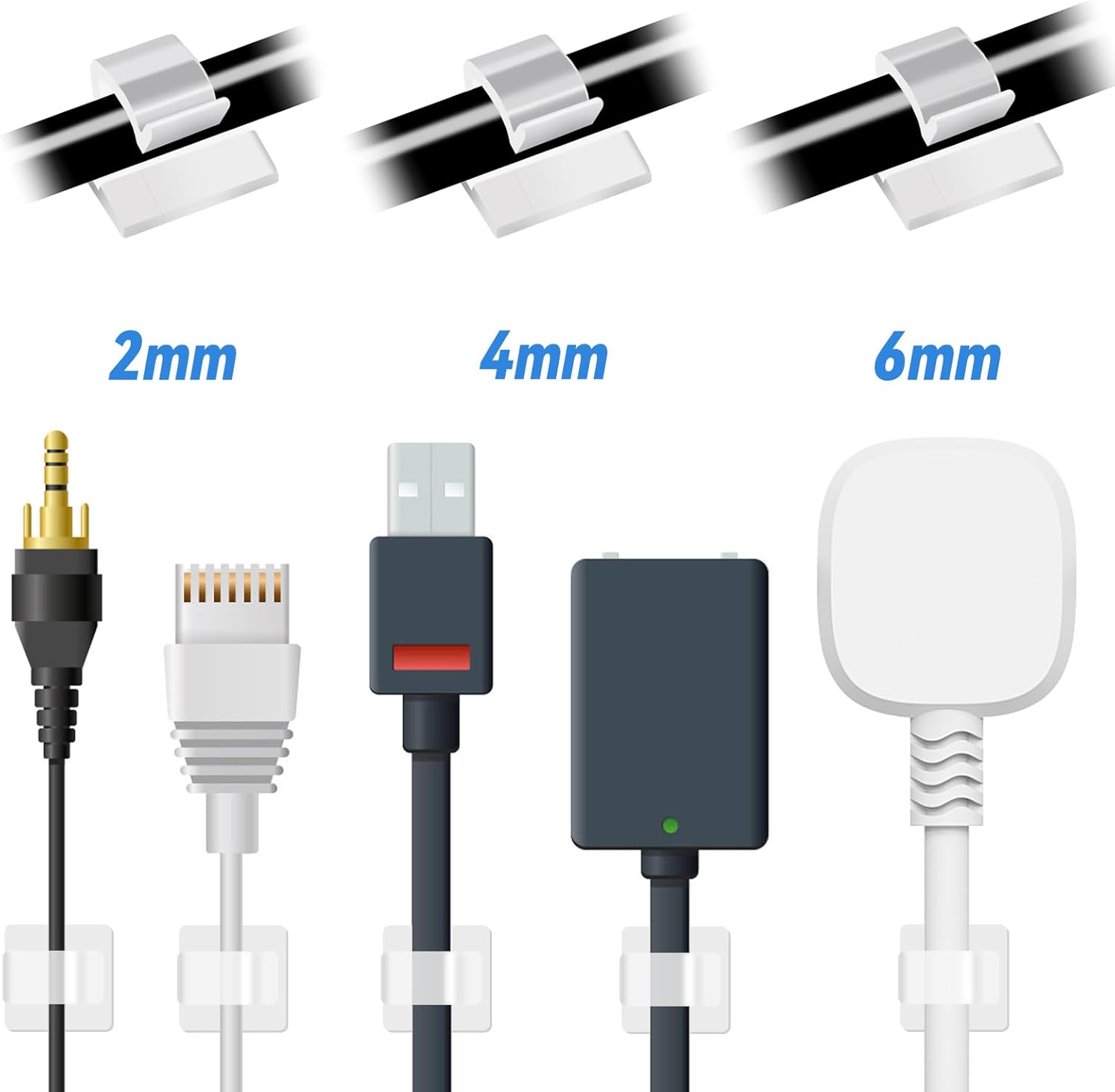 - Widely Used: The size of the cable clips is 5.5 inch/14 mm, which is suitable for all kinds of wires within the width of 6 mm, including outdoor lights, USB wires, mobile phone chargers, Ethernet cables, power cords, etc. Widely used in homes, gardens, offices and automobiles, and easy to install on different surfaces such as tables, walls, plastics, wood, glass and metal