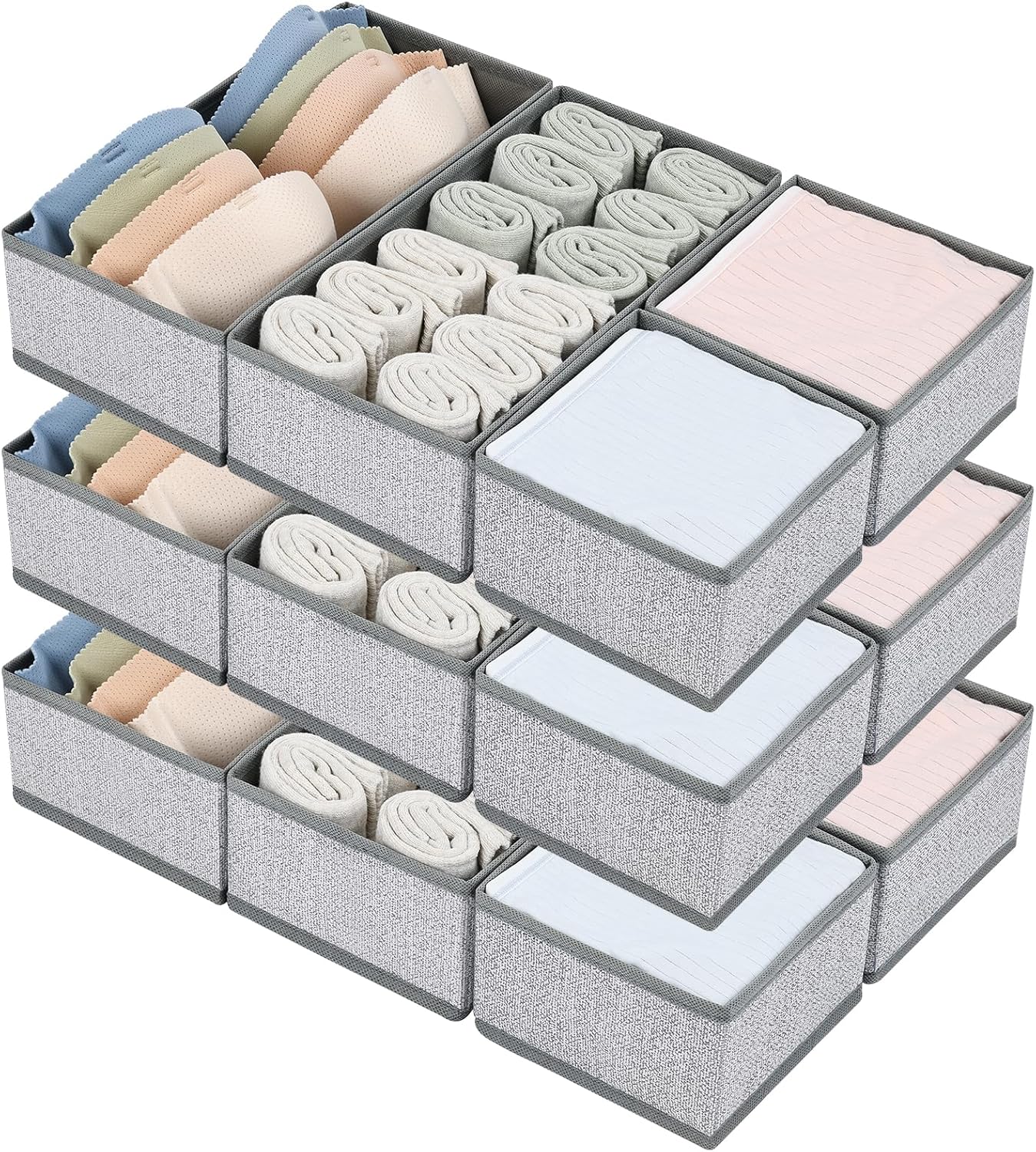 DIMJ Drawer Organizers for Clothing, Set of 12 Dresser Drawer Organizers, Fabric Closet Organizers and Storage, Drawer Dividers for Baby Clothes, Socks, Belt, Tie (Blended)