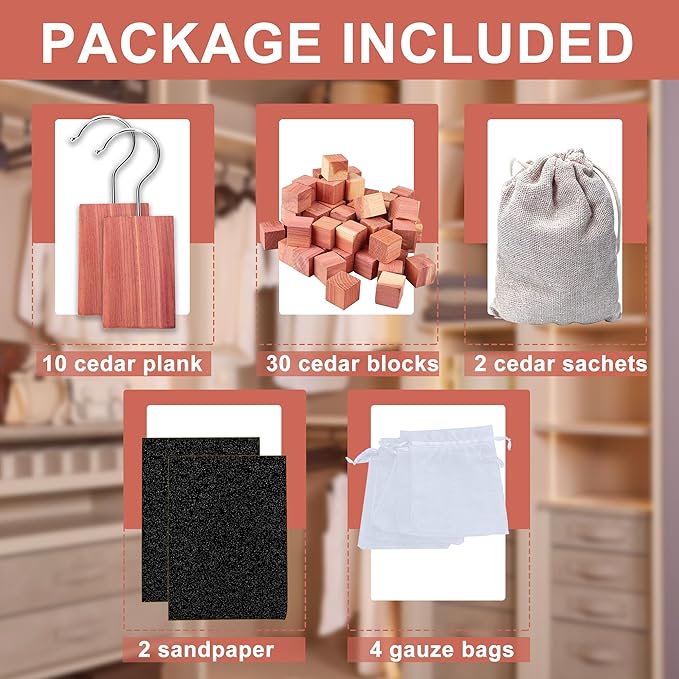 - Valueable Package :You will get 10 cedar hang ups for closets, 30 cedar blocks for clothes storage /drawers, 2 cedar sachets with natural cedar scent, 2 pieces of sandpaper and 4 gauze bags. Our cedar wood sets cover almost every occasion where cedar blocks are needed, to hang up on hangers, put in a drawer/ storage bag or put a cedar sachets in a handbag