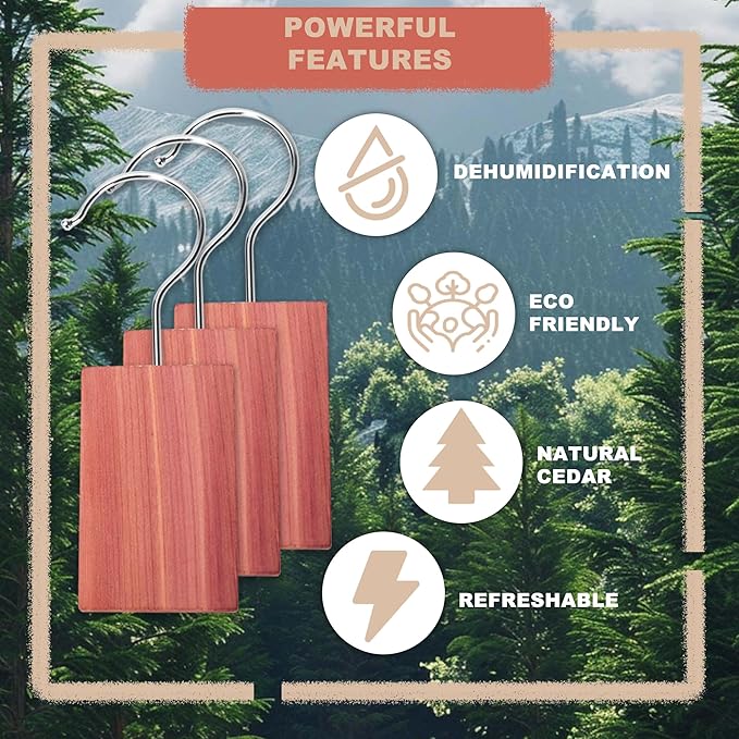 - Natural Cedar Wood :Our cedar blocks for clothing storage are made from eastern naturally grown cedar, no chemical additives, all cedar wood with an aromatic cedar scent, the cedar hang ups in the closet can soak your clothes with the natural smell of cedar, and effectively absorb moisture and odorsuse protect your valued clothes, safe for pets and small children alike and friendly to the environment