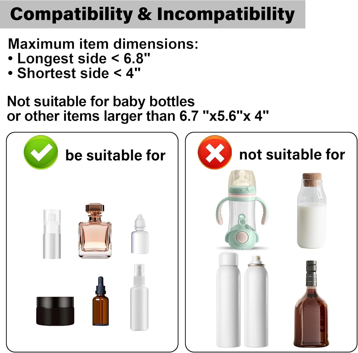 - Multiple Sizes and Expandable: This set includes 2 individual acrylic drawer units, offering a total of 6 drawers, these clear drawer organizers provide customizable combinations to meet your specific storage and organizational needs. Each acrylic drawer units is 4.2x6.89x9.92 inches. The largest drawer is 5.7 (L) × 4.2 (H) × 6.9 (W) inches, while the smallest one is 4 (L) × 2 (H) × 6.9 (W) inches. Not suitable for baby bottles or other items larger than 6.7 "x5.6"x 4".