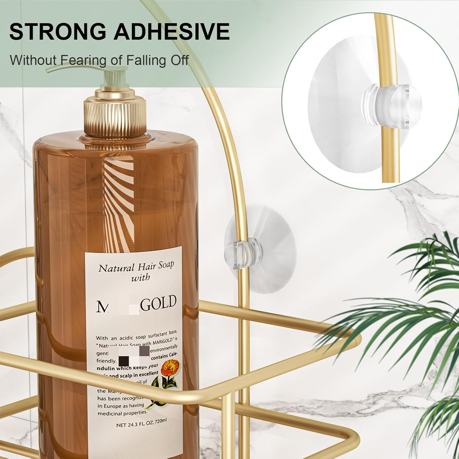- Anti-Slip and Anti-Swing - The overhead shower shelf with an exclusive U-shaped rubber collar (fits most of the shower head), preventing the shower hanger sliding down and increase friction. Additional 4 suction cups is quite sticky for the flat surfaces, holding the bathroom organizer in place without wobbling and shaking.