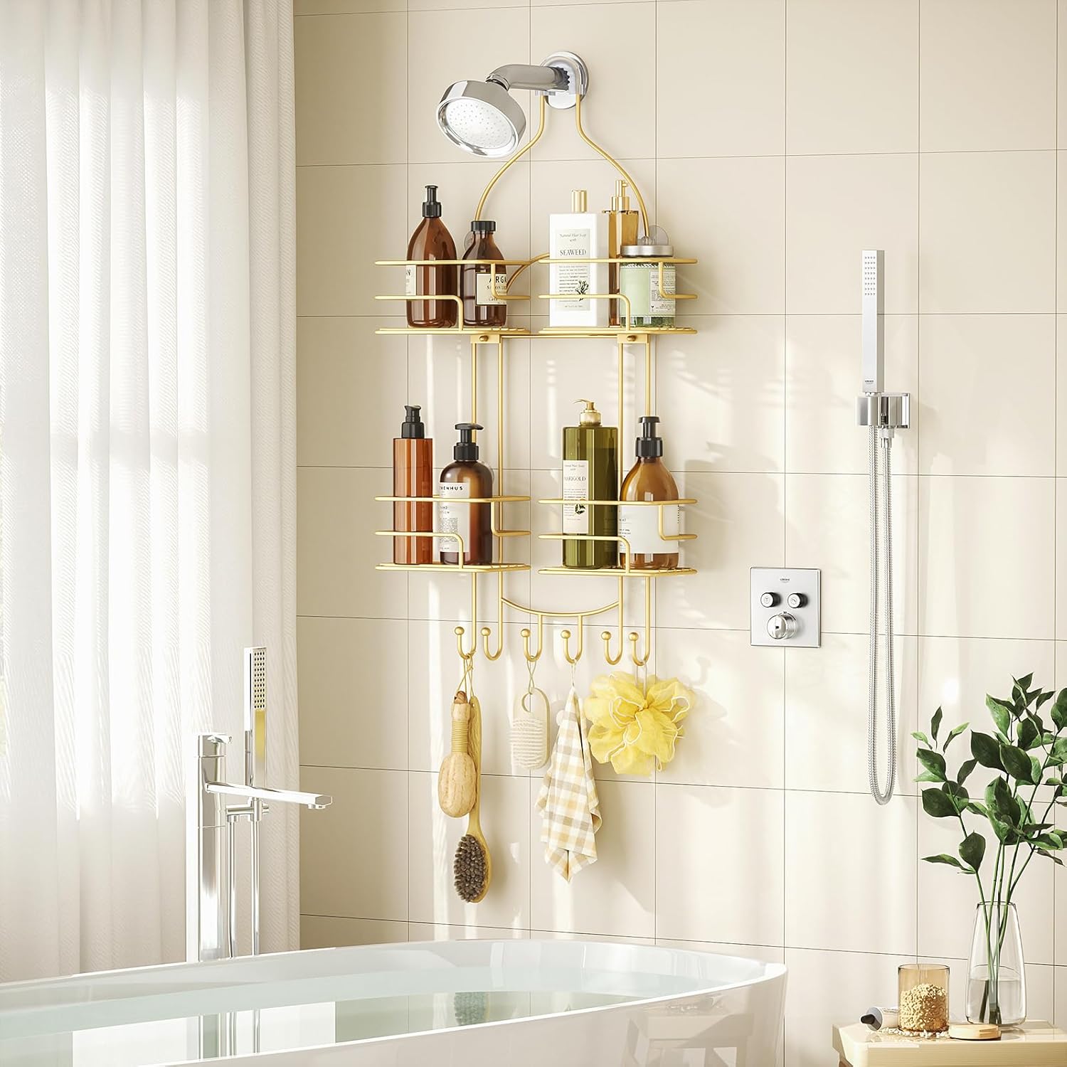 - Split Design - Features a split design with a center opening, it works excellently with the handheld shower hose and allows for the hose from the showerhead to hang down. Additionally, 6 hooks can be used for hanging razors, loofahs, bath balls, and towels.