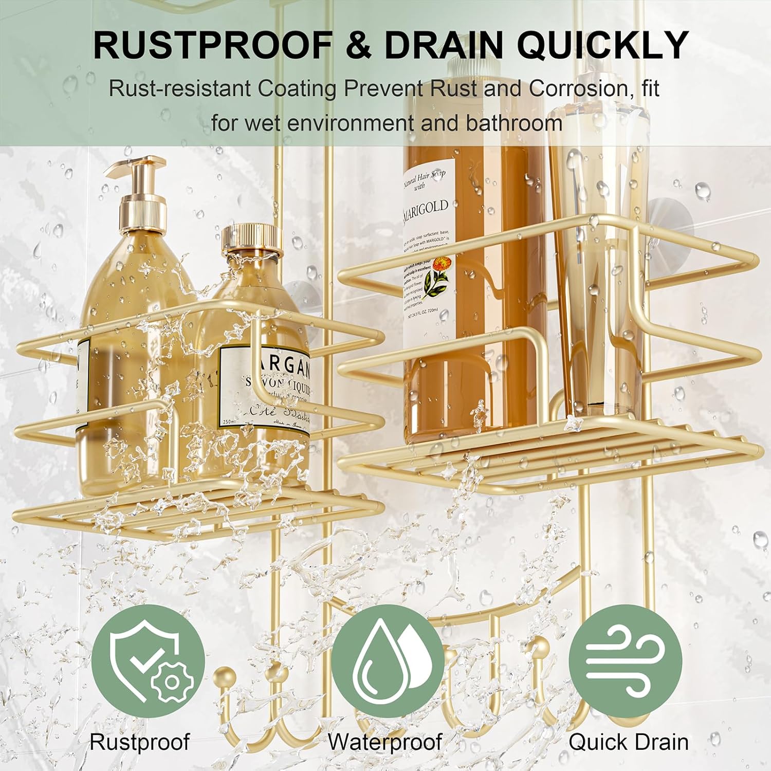 - Rustproof & Fast Draining - SRIWATANA shower rack is made of durable iron and powder coating, which not only prevents rust but also stands up to times of use. Suitable for wet environments like bathrooms. This hanging shower organizer is hollowed out design, making drainage more convenient and allowing shower supplies to dry more efficiently after use, also reduces the risk of rust.