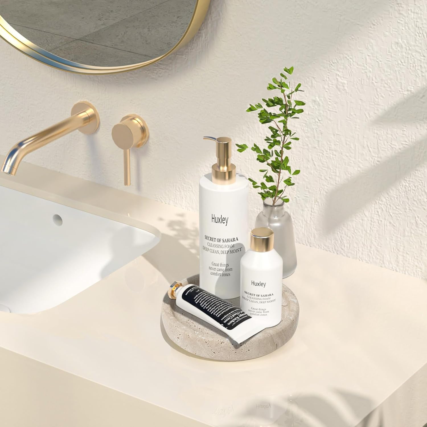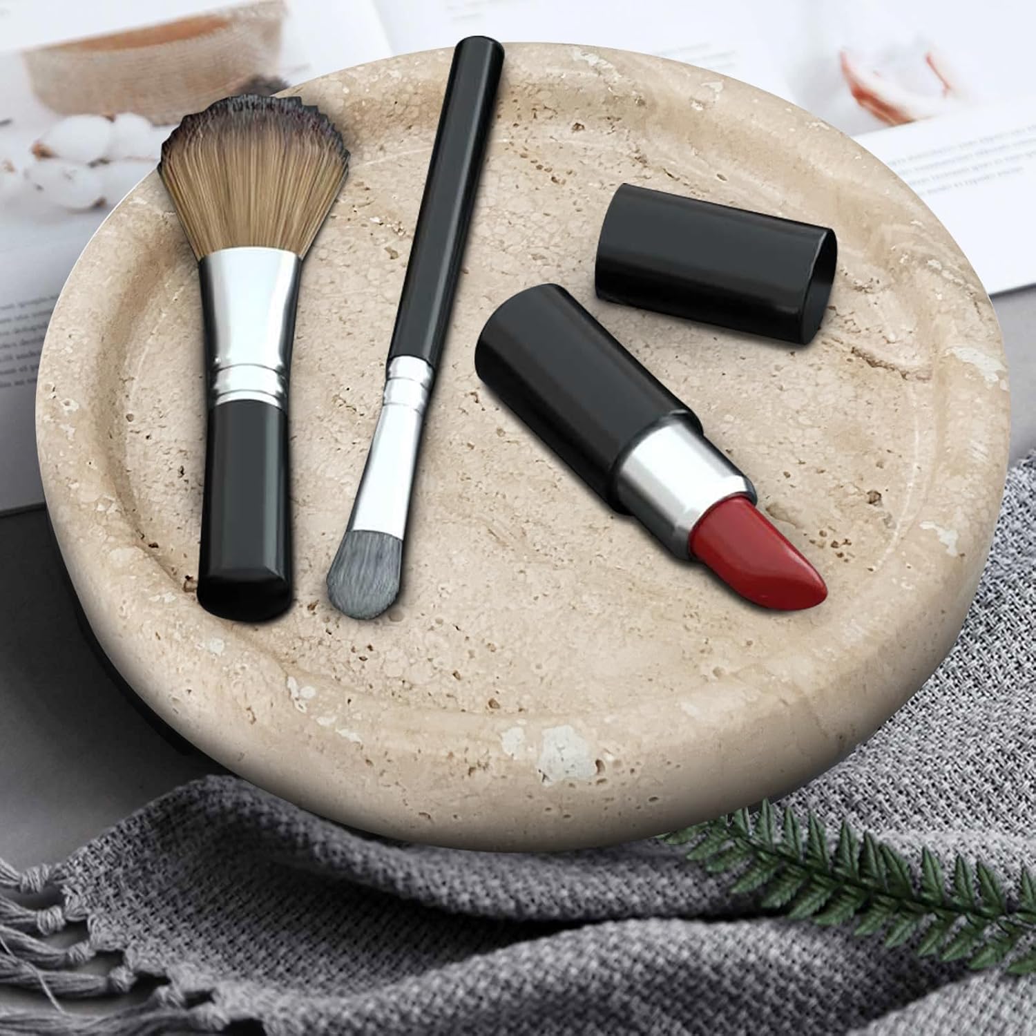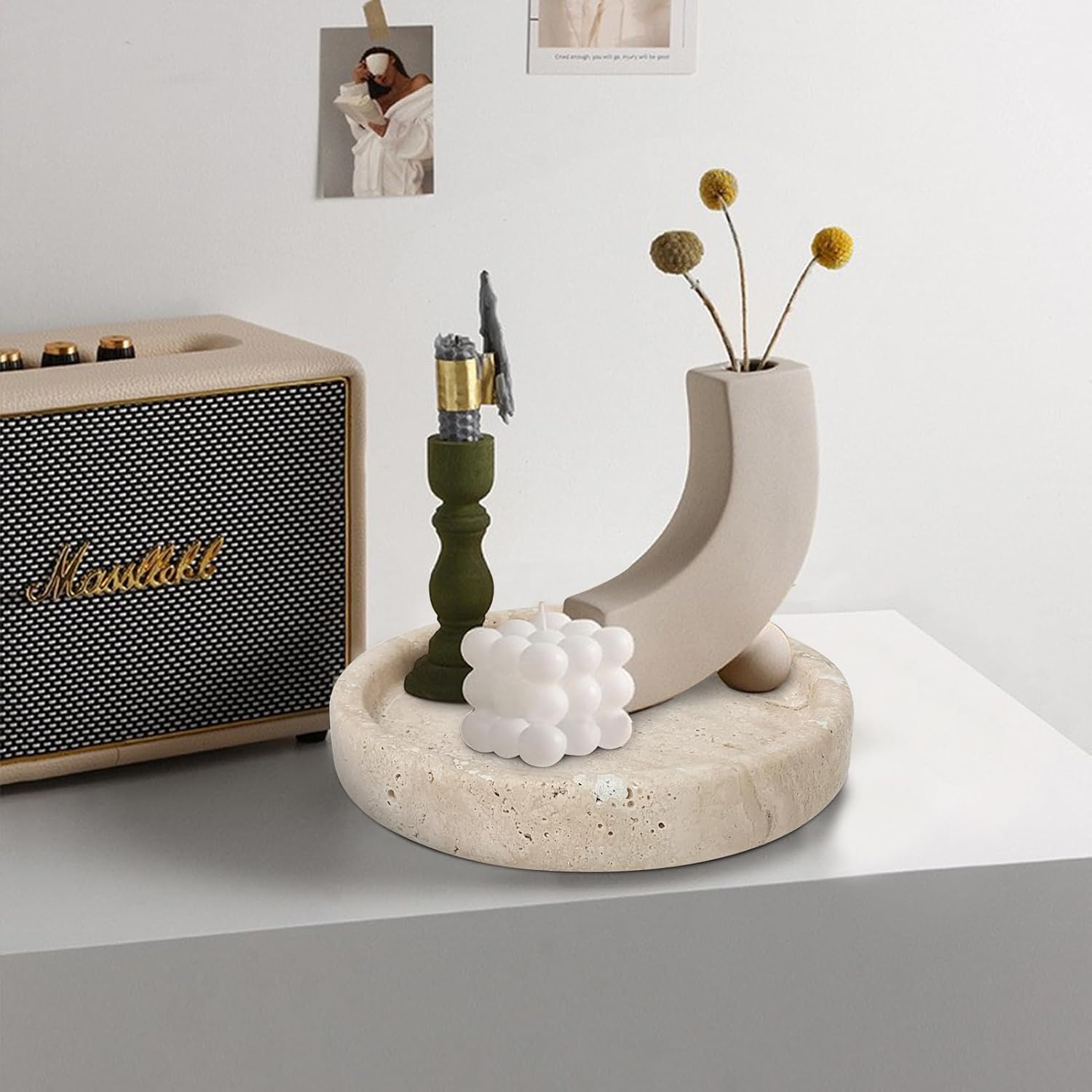 Travertine Tray, Small Ceramic Vanity Tray for Bathroom Counter Decor, Round Marble Decorative Trays for Coffee Table (Beige, Small Size)
