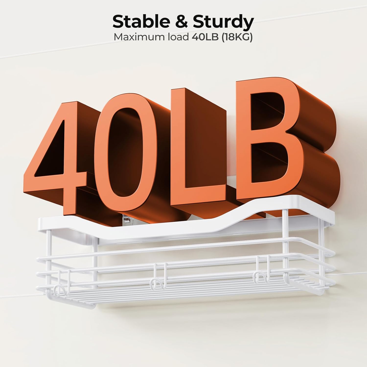 Orimade Shower Caddy Basket Shelf Storage Rack, No Drilling Wall Mounted Adhesive Rust Proof Stainless Steel Shower Organizer with 5 Hooks for Bathroom, White 2 Pack