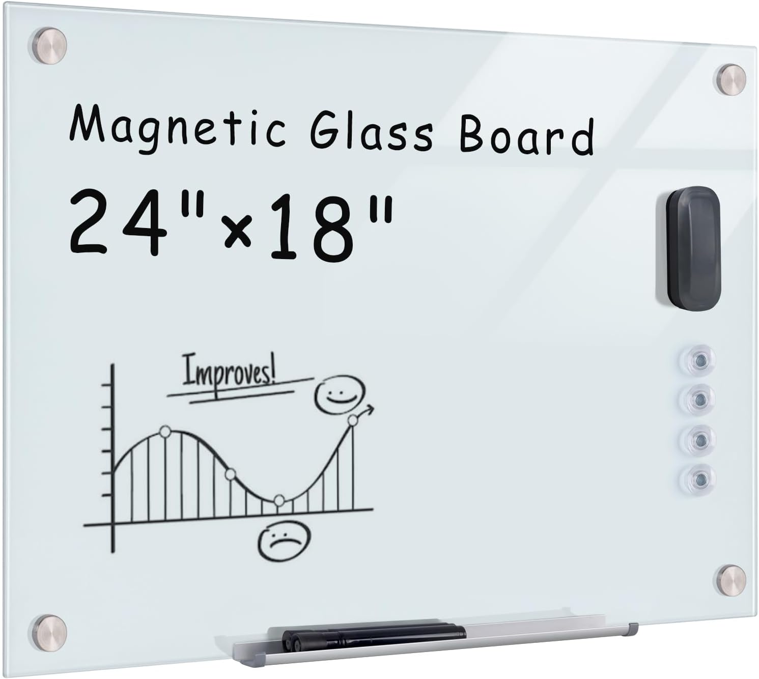 Magnetic Glass Whiteboard,24"x18" Wall Mounted Frameless Dry Erase Board for Office, Home & School White