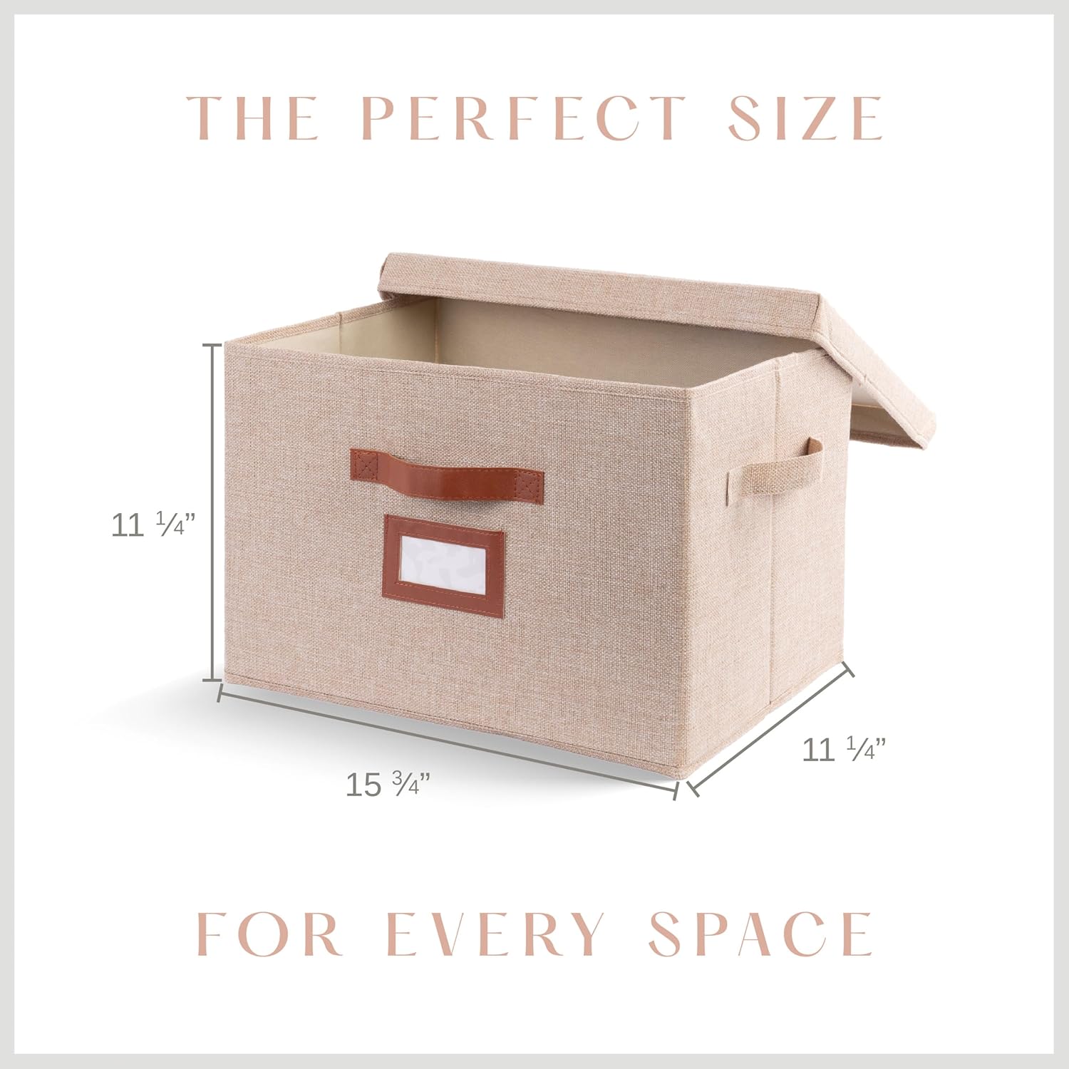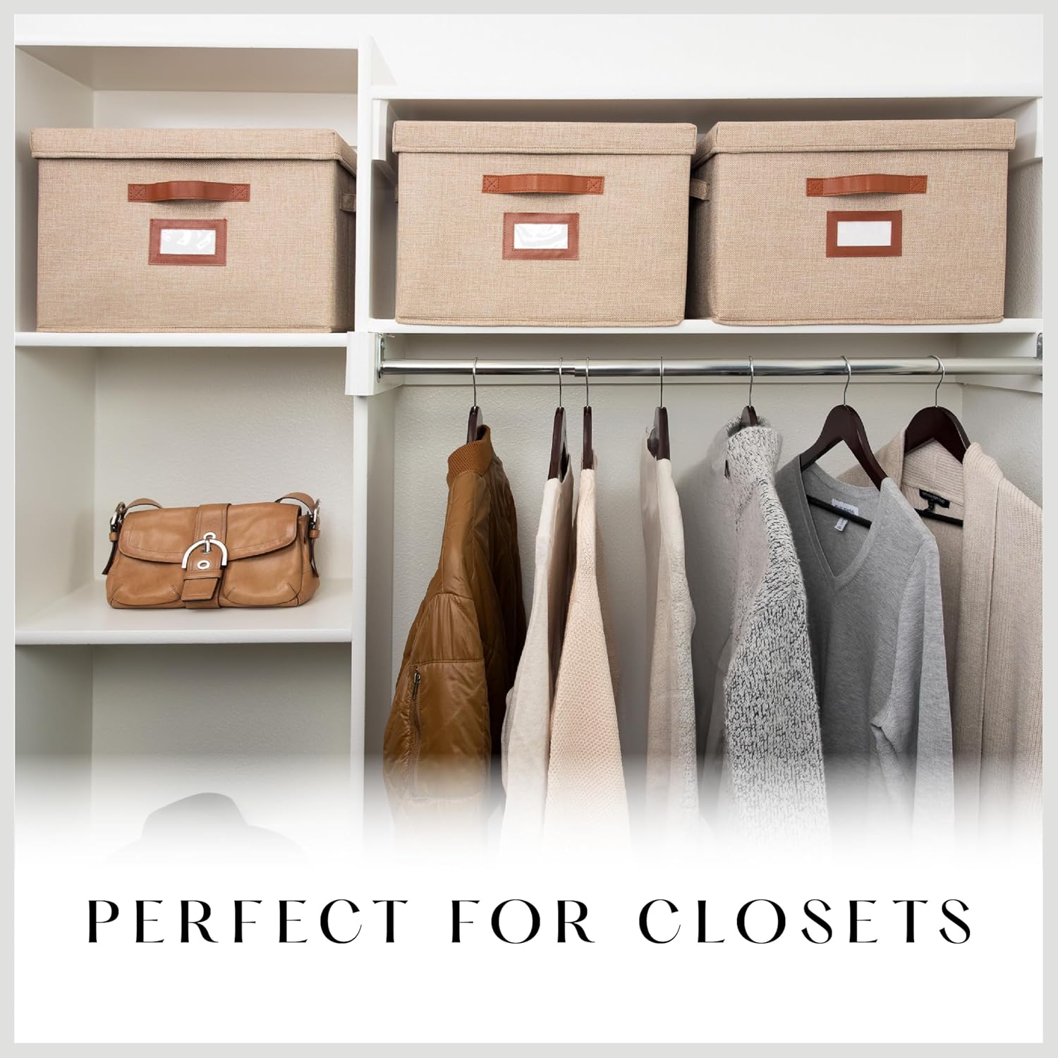 3 Pack Large Fabric Storage Box with Lid - Decorative Bin with Lid, Label Holder, Faux Handles - Large Decorative Storage Boxes with Lids for Organizing Clothes, Blankets - Oatmeal
