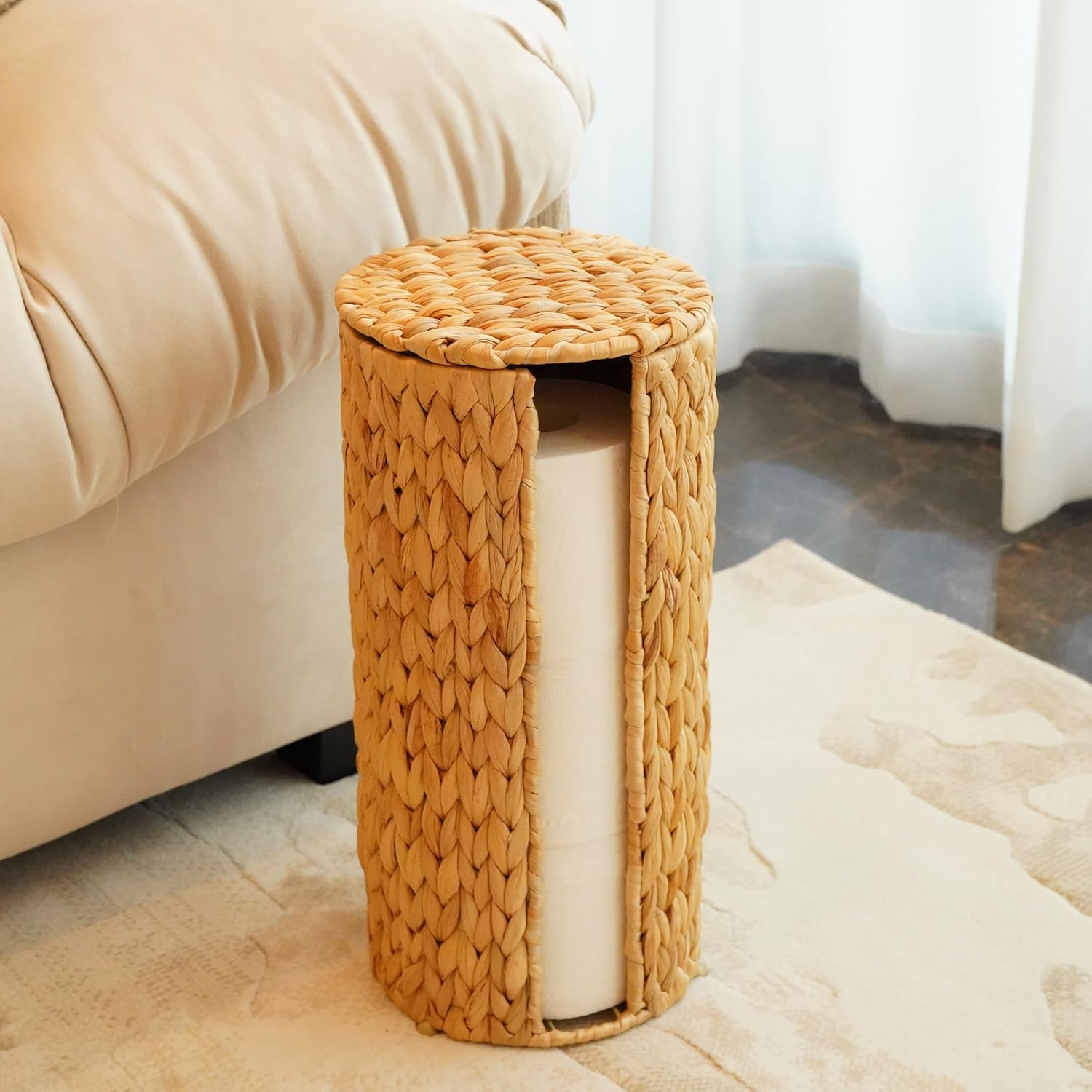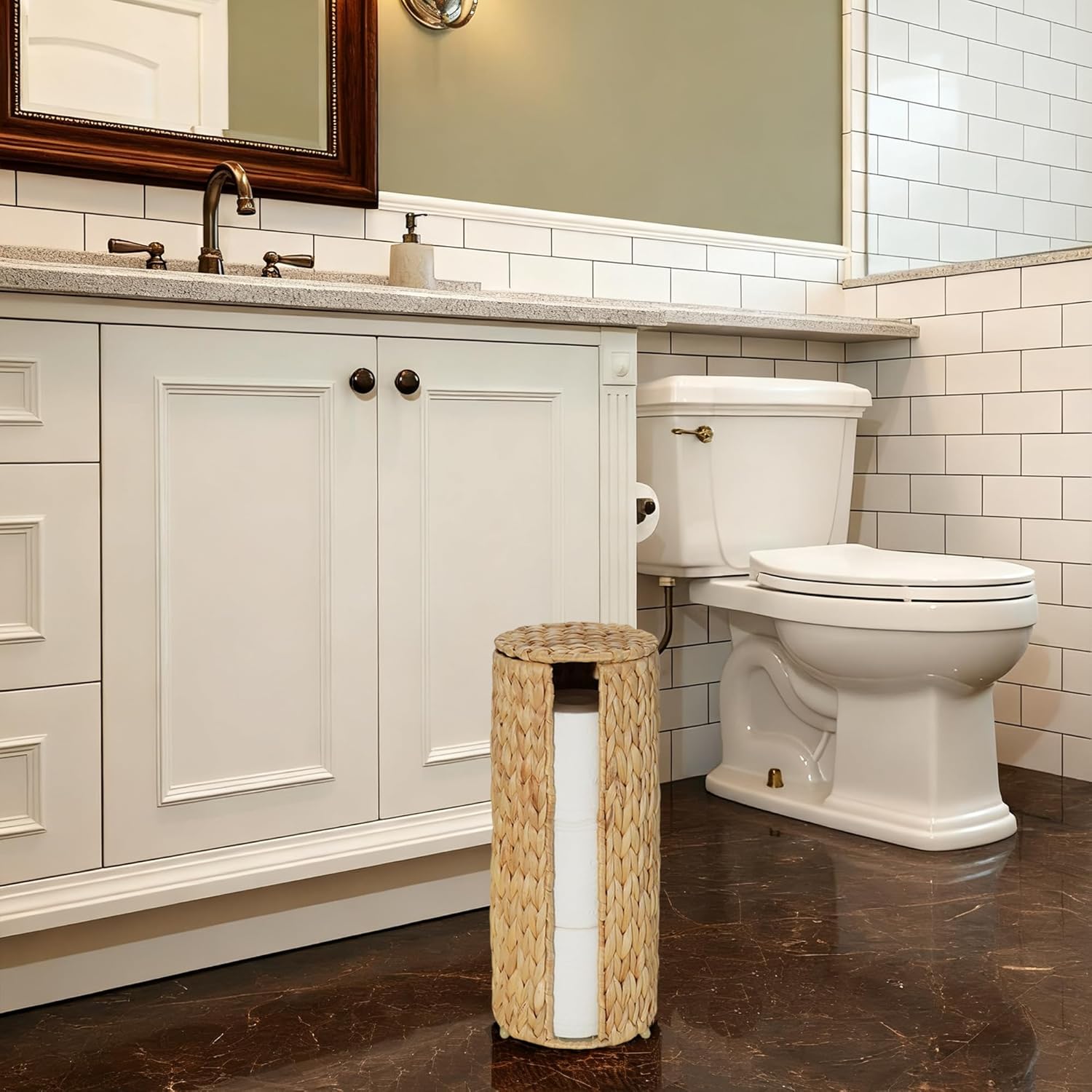 PINXIURY Water Hyacinth Paper Roll Holder, Wicker Toilet Paper Holder Stand for Bathroom, 3 Rolls of Toilet Paper Storage, Toilet Roll Holder Stand for Bathroom and Under Sink