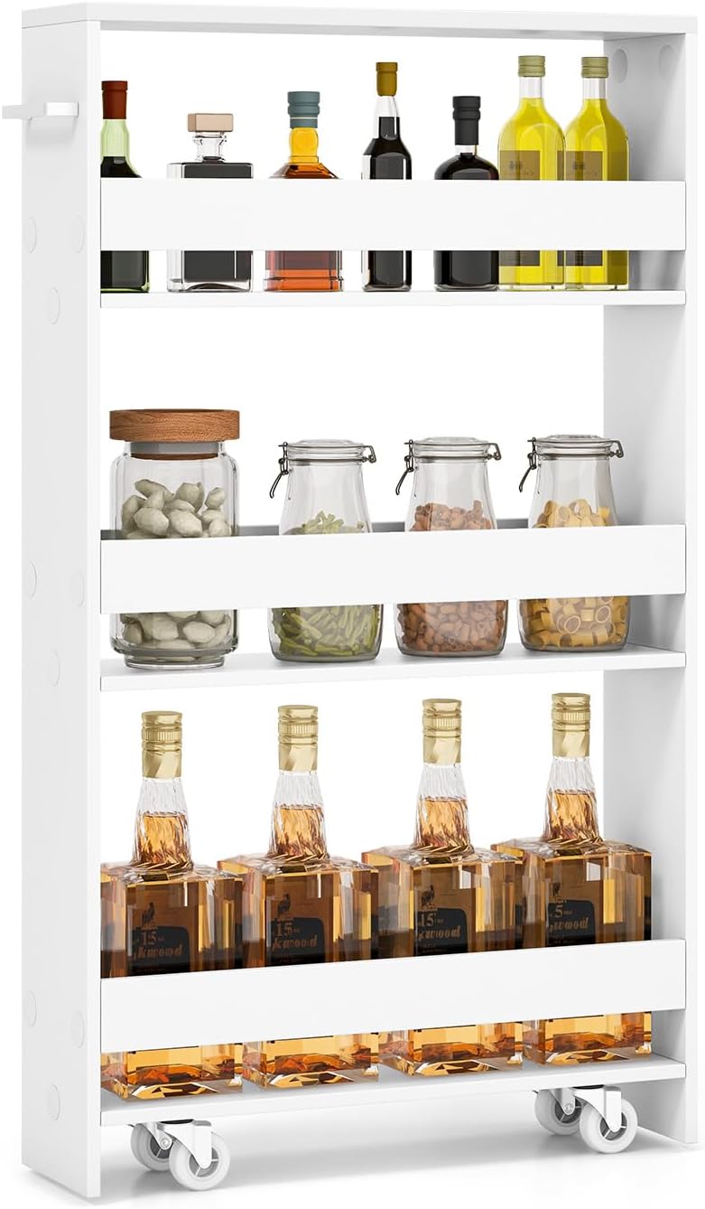 - Space-saving Design: Our slim rolling storage cart is only 5” wide and fits perfectly in tight places, allowing you to maximize the storage potential of limited space. Whether it's a crevice next to the washing machine or refrigerator, it can turn a narrow space into an organized storage area.