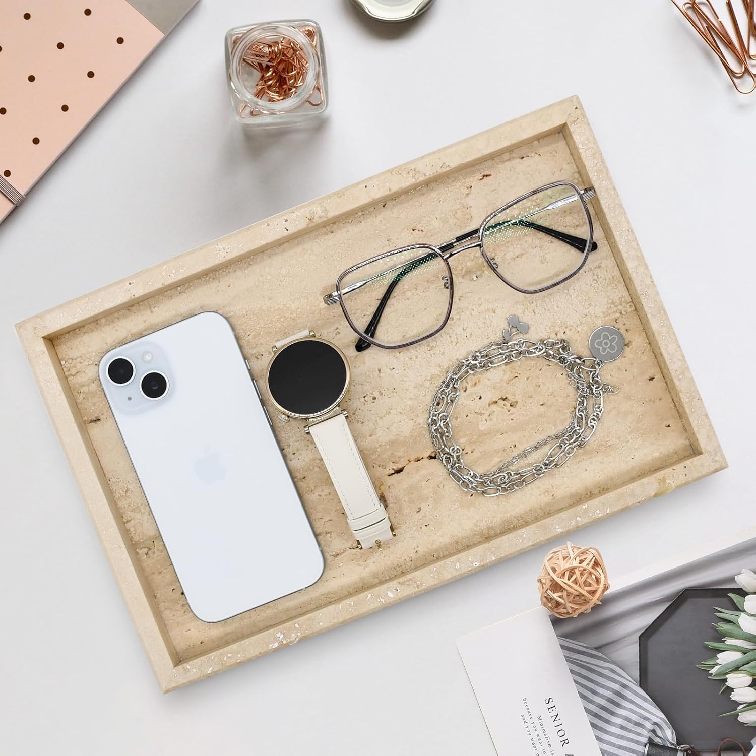 Real Natural Travertine Tray for Bathroom, Vanity, Kitchen and Desktop, Rectangle Genuine Travertine Stone Tray for Jewelry, Cosmetics, Candles, Lotion, Perfume and Home Decor