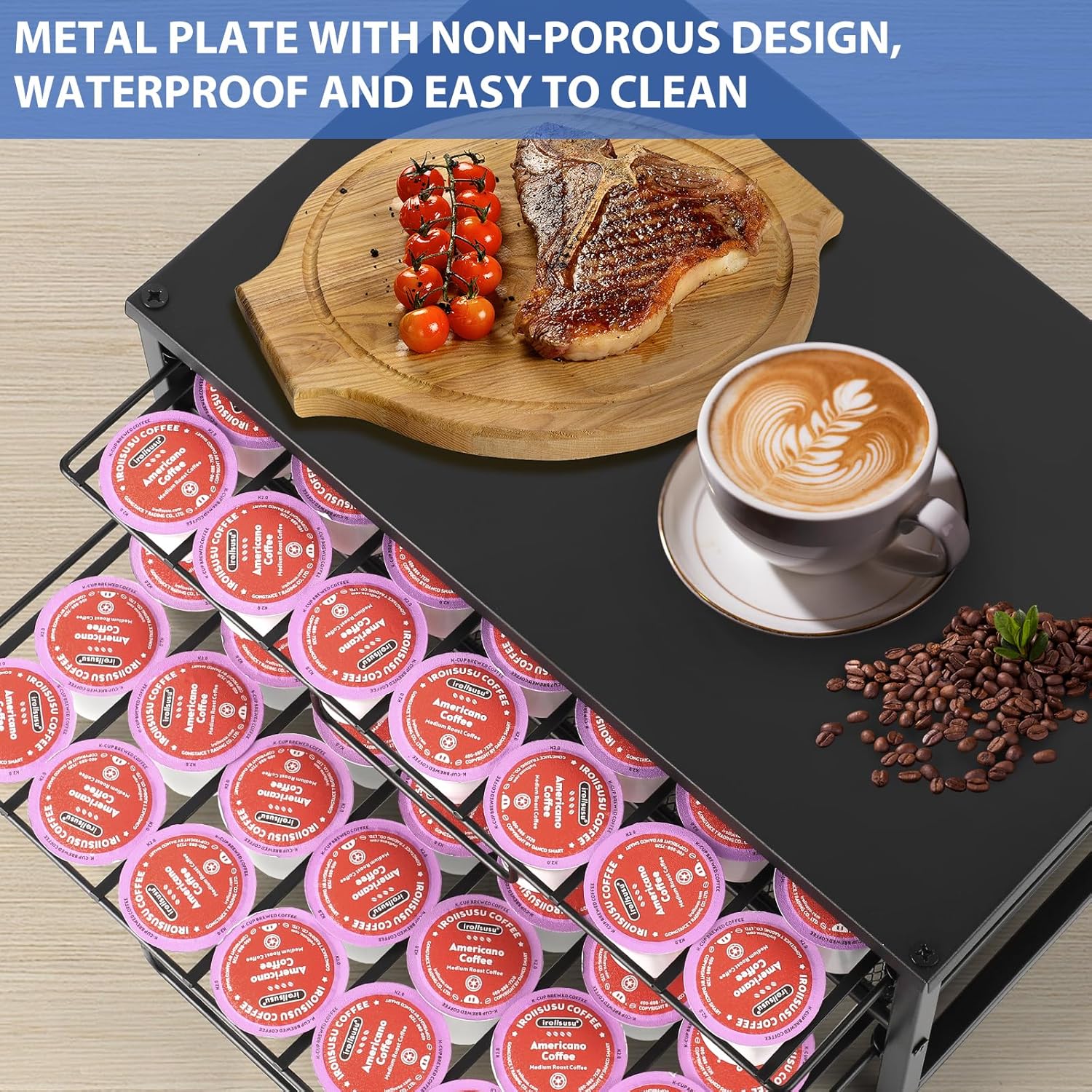 - 【Large Capacity】 The ECOLOVI k cup holder organizer features two spacious storage drawers that can hold up to 70 coffee pods. The pull-out design allows you to easily access and organize your favorite coffee flavors, keeping your coffee area tidy and organized