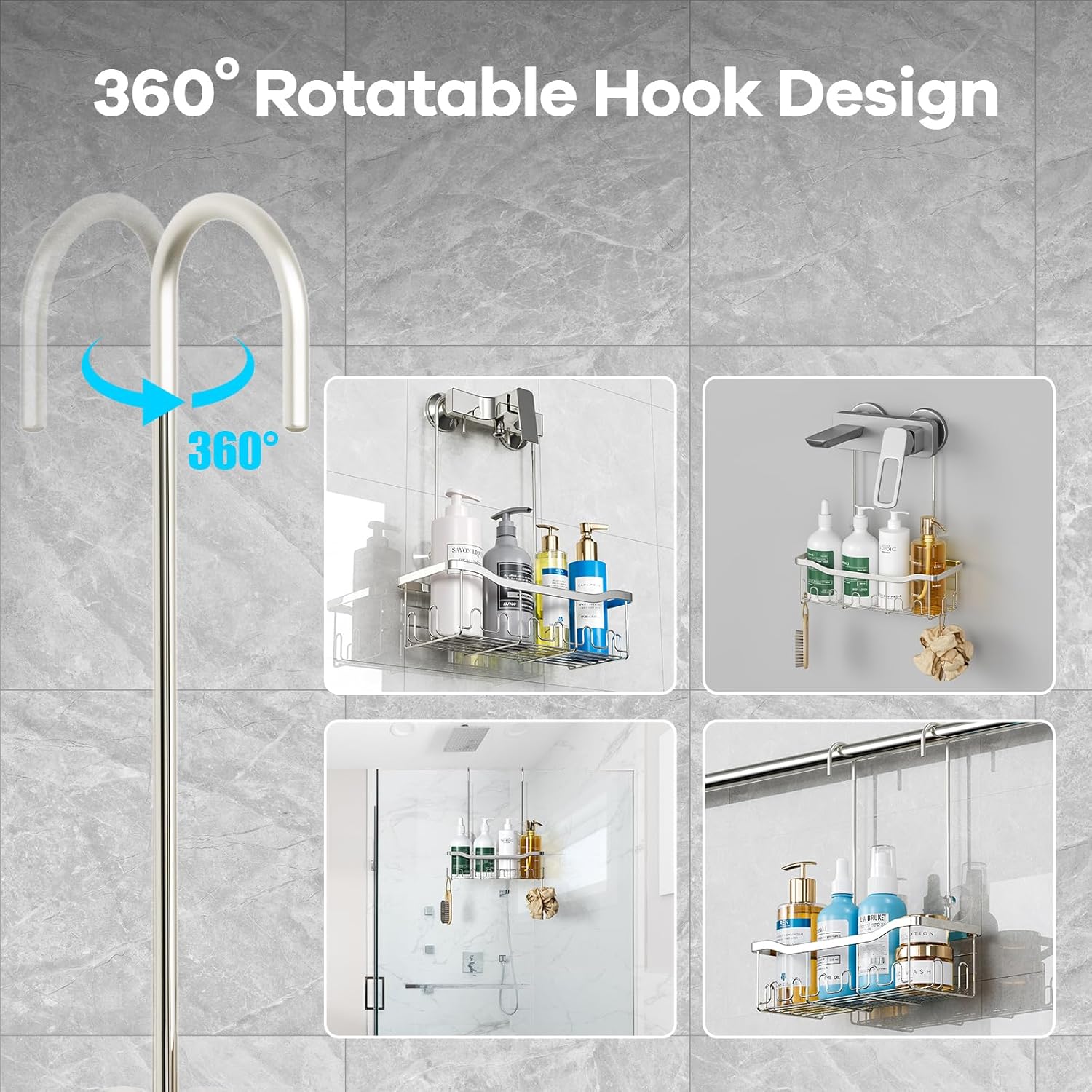 - Shower Caddy Hanging - The 360° rotatable hook design eliminates the need to fix the shower rack to the wall, so it will no longer damage the wall and fall off. The hanging shower storage rack is very convenient and mobile, the distance between the two rods is about 17 cm, it suitable for different angles, different shapes of railings and faucets. The curved hooks of the rods are designed with rubber coating to prevent scratching of the water-faucet. This rotatable shower organizer can be hung over the door, over the shower head, towel bar and curtain rod.