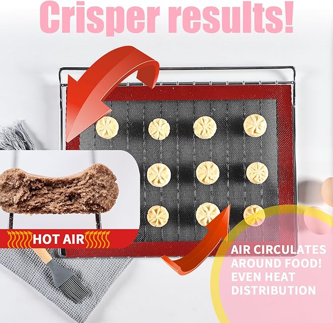 - Even Heat Distribution: The mat’s surface with hollow design that effectively enhance air circulation, ensuring evenly distributes heat of food with no burnt or undercooked spots, and leaving no residual odors. This design also prevents food from sticking and makes it easy to clean away burnt sugar and fat.